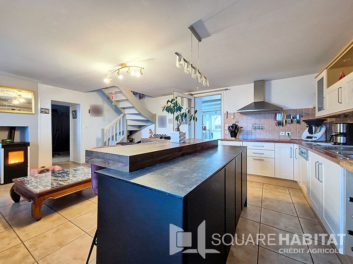 - Au rez-de-chaussée : belle véranda de 18 m² donnant sur le jardin avec terrasse, séjour avec poêle à pellets, cuisine américaine aménagée et équipée, une chambre/un bureau, une salle d'eau avec WC et fenêtre.