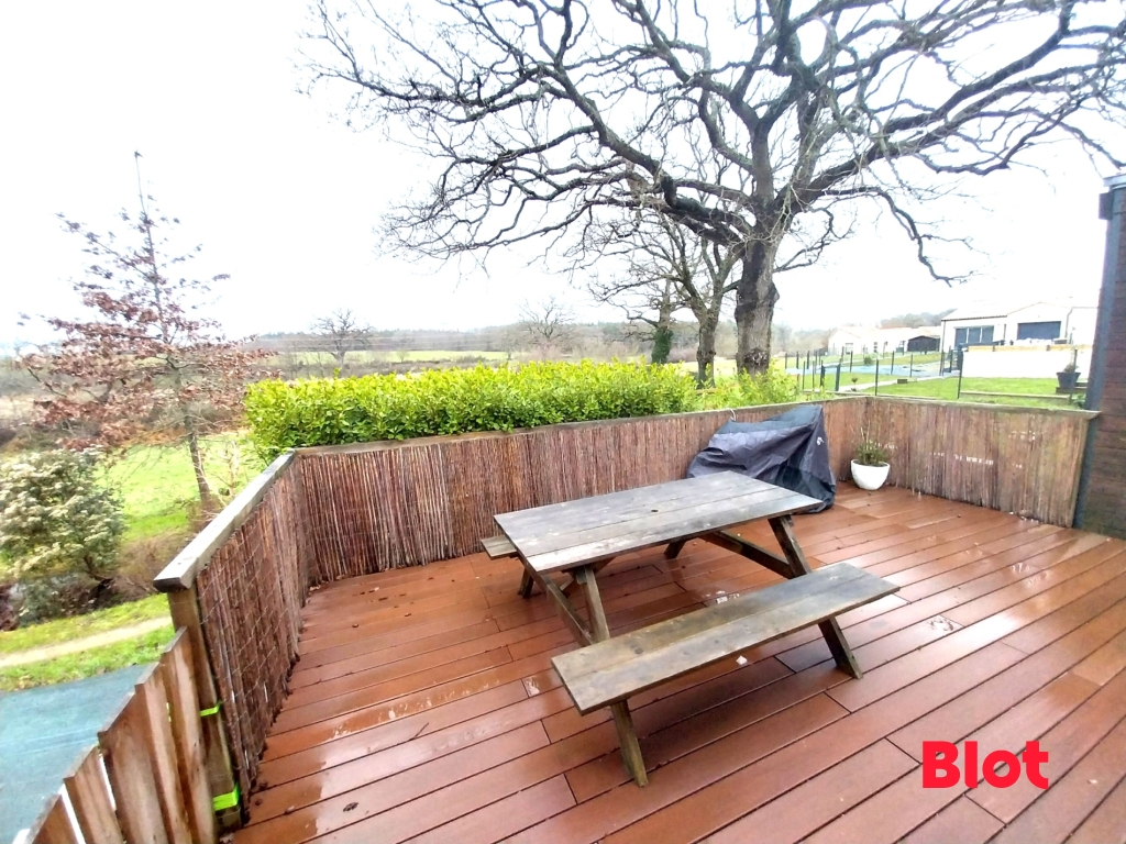 Bien que située en lotissement, la maison bénéficie d'une terrasse offrant une vue sur un écrin de verdure. Moment de calme assuré!