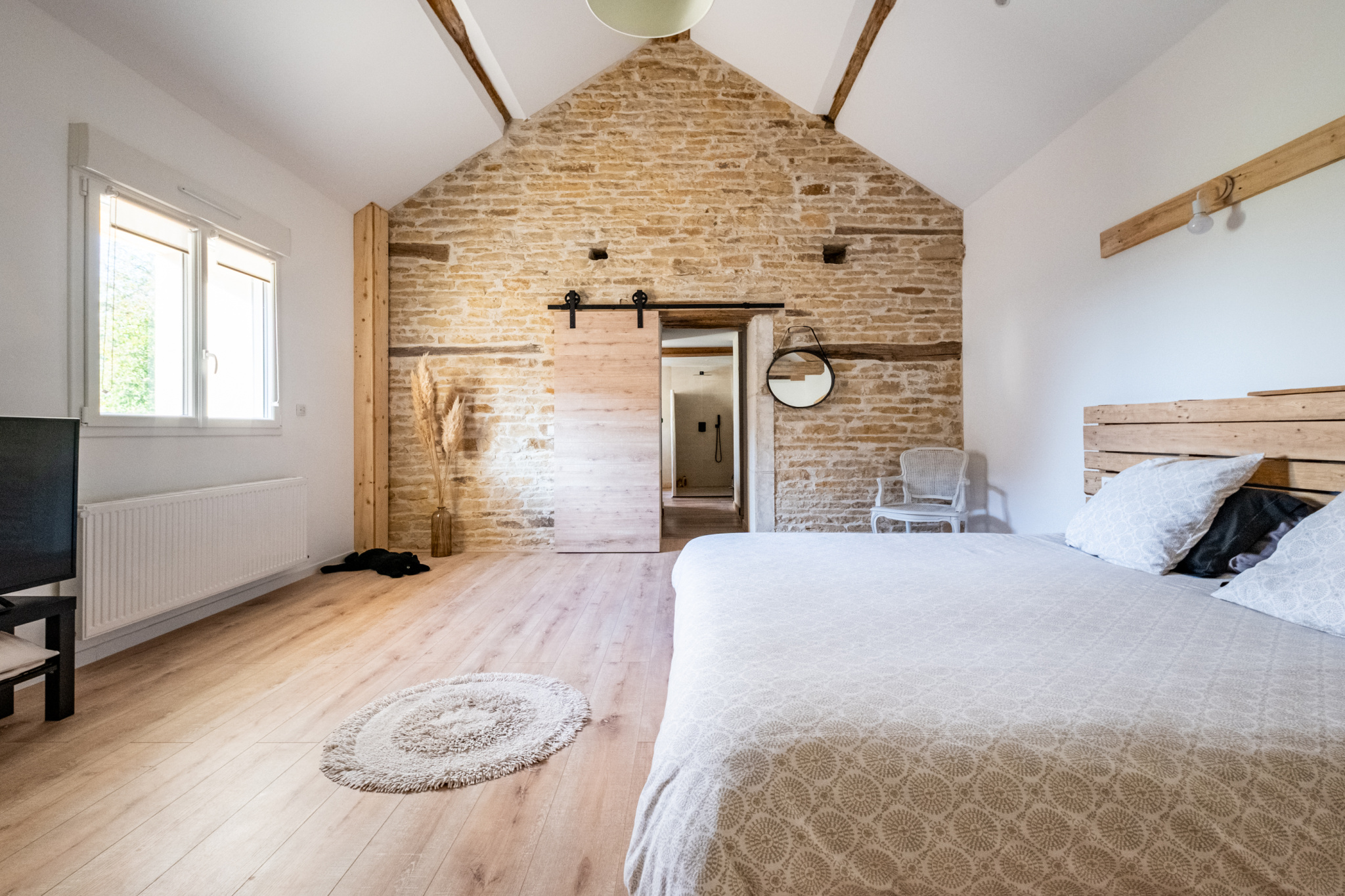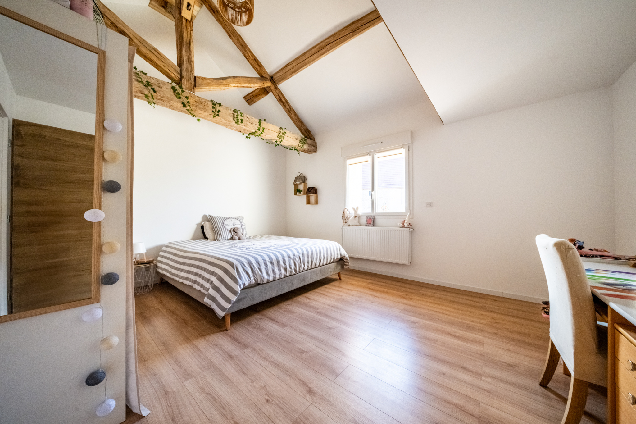 À l'étage, vous trouverez trois grandes chambres, dont une seconde suite parentale, une salle de bains avec douche, ainsi qu'un WC indépendant. La maison est d'une surface totale de 250m2 avec ses mezzanines.