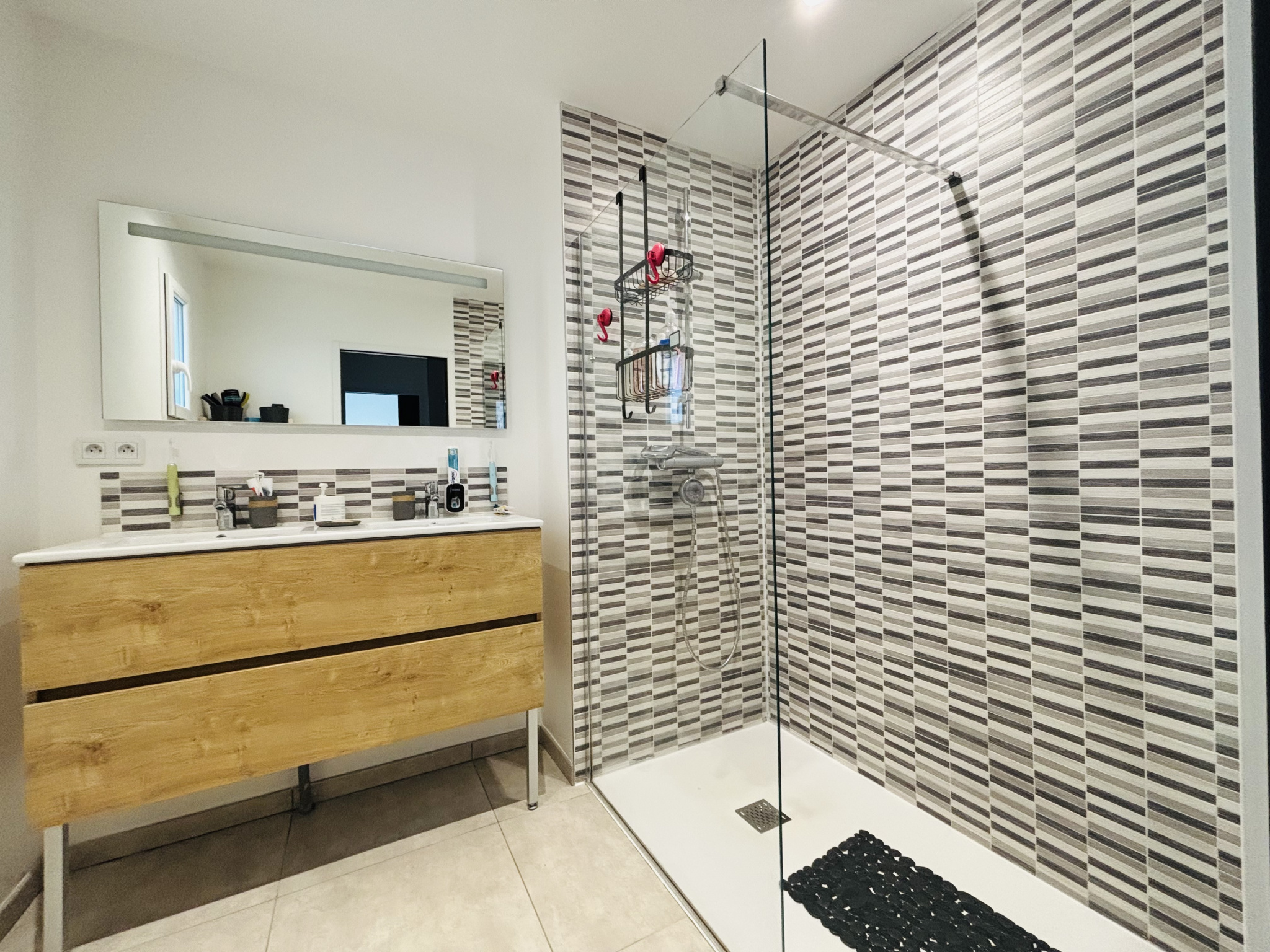 Elle se compose d'un hall d'entrée avec vestiaire, d'une pièce de vie lumineuse ouverte sur l'extérieur de par ses grandes baies vitrées sans vis à vis, la cuisine équipée moderne et fonctionnelle s'intègre harmonieusement au séjour