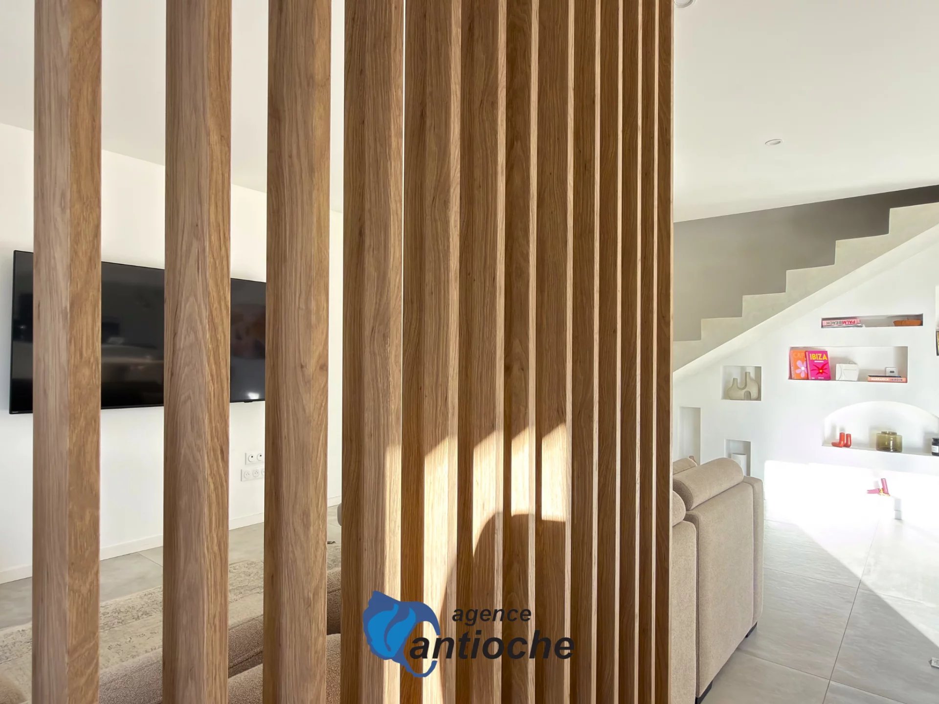 Un escalier traditionnel en béton ciré mène à l’étage, où un palier dessert trois chambres, dont une suite parentale avec dressing et salle de bains, un WC indépendant et une salle d’eau avec double vasque.