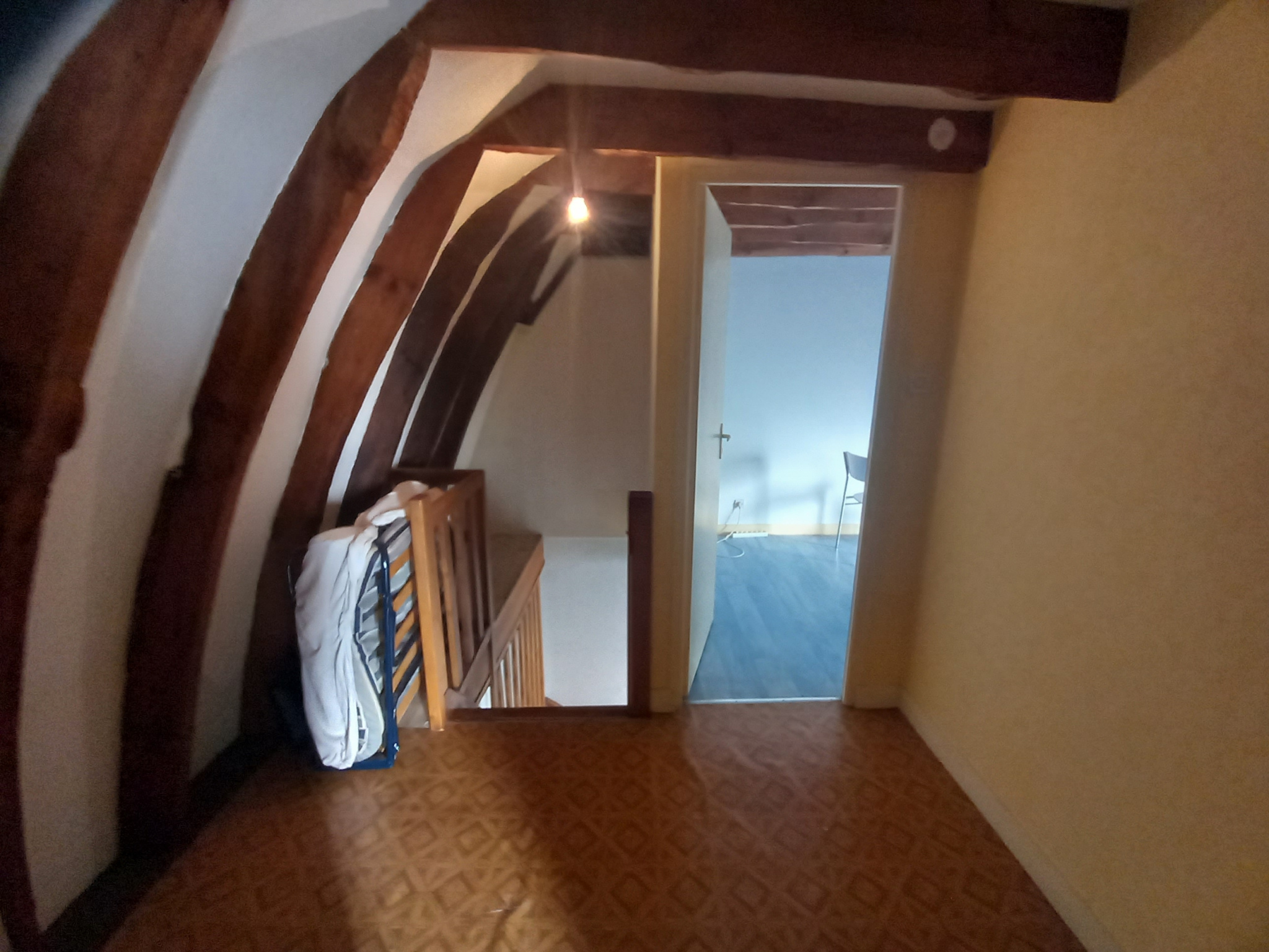 À l'étage, un palier dessert deux chambres au charme authentique, avec une charpente bateau apparente.