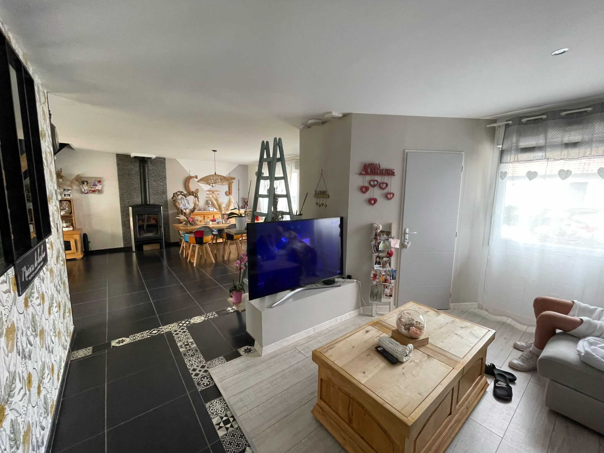 pièce de vie de 60m2 composée d'un séjour ouvert avec poêle a bois et cuisine équipée