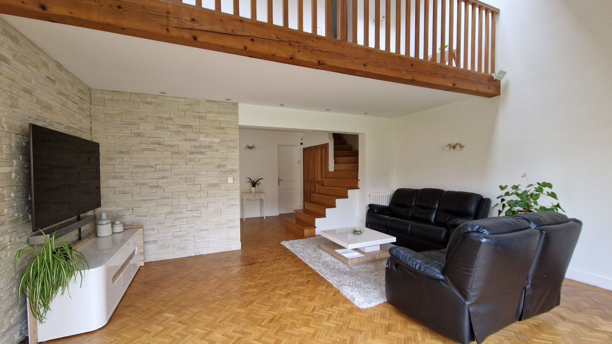 Au rez de chaussée: d'un hall d'entrée avec placard, une grande cuisine équipée avec coin repas et annexée d'un cellier + une pièce au dessus, une salle à manger (pouvant être transformée en chambre) et un séjour double très lumineux avec plafond cathédrale, une salle d'eau, wc et buanderie/ chaufferie.