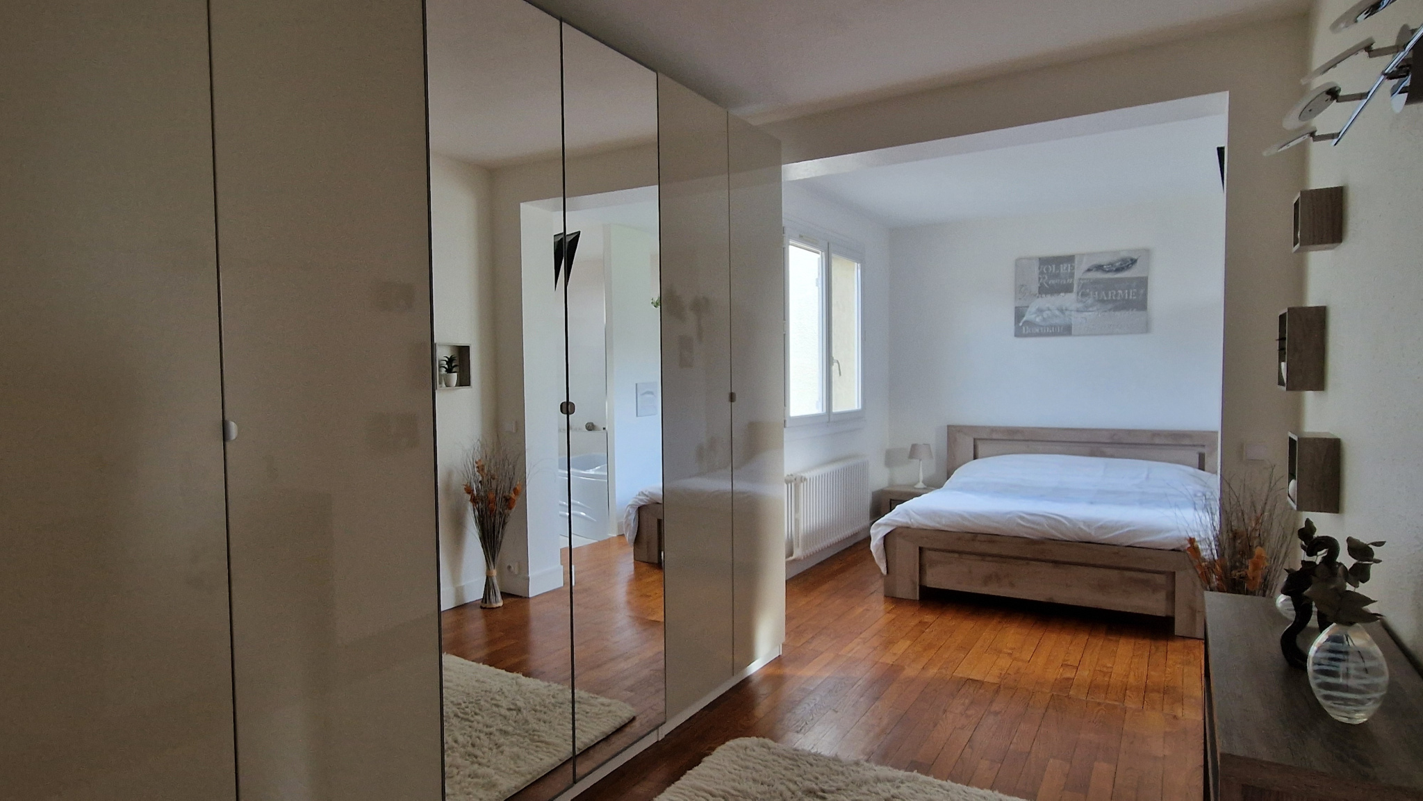 A l'étage: un bureau ouvert sur le salon, 2 chambres dont une suite parentale + 20m2 avec dressing aménagé et SdB neuve avec douche, baignoire et toilettes, une deuxième salle de bains récente et wc indépendant.
