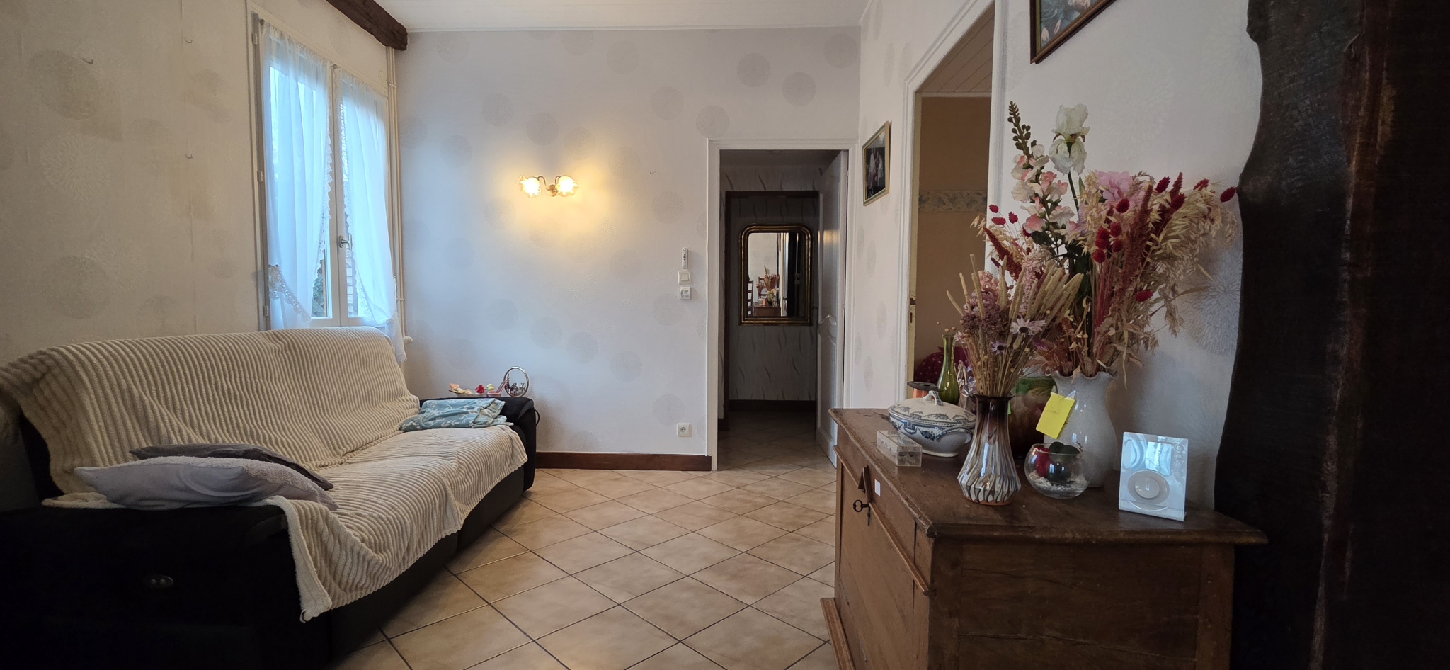 La maison située en hauteur est composée d'un hall d'entrée avec rangements, un séjour/salon avec p/fenêtre sur terrasse à la vue dégagée, cuisine indépendante, deux chambres, salle d'eau et wc indpt.