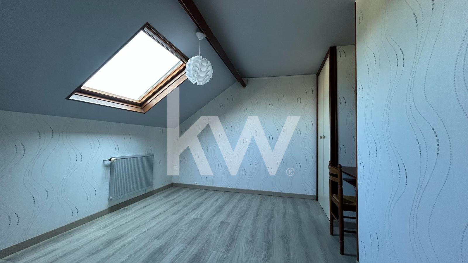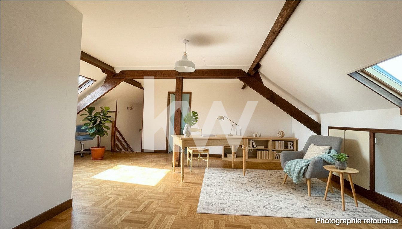 À l'étage : trois chambres, une salle de bain et un vaste espace à aménager selon vos besoins ? chambre supplémentaire, salle de jeux ou bureau indépendant.