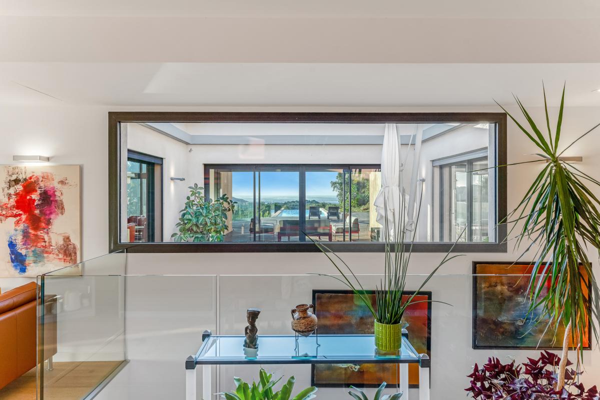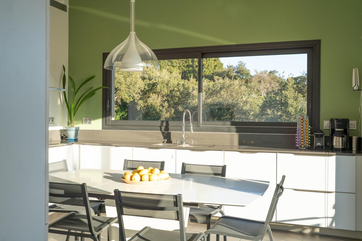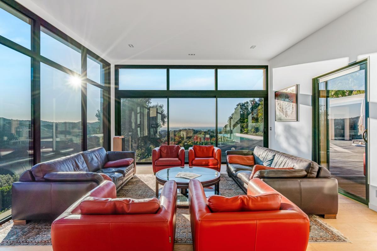 La villa propose de vastes espaces de réception comprenant un salon vitré à la vue panoramique, ouvert sur la piscine et la mer, un salon plus intimiste avec cheminée, ainsi qu'une cuisine entièrement équipée avec cellier.
