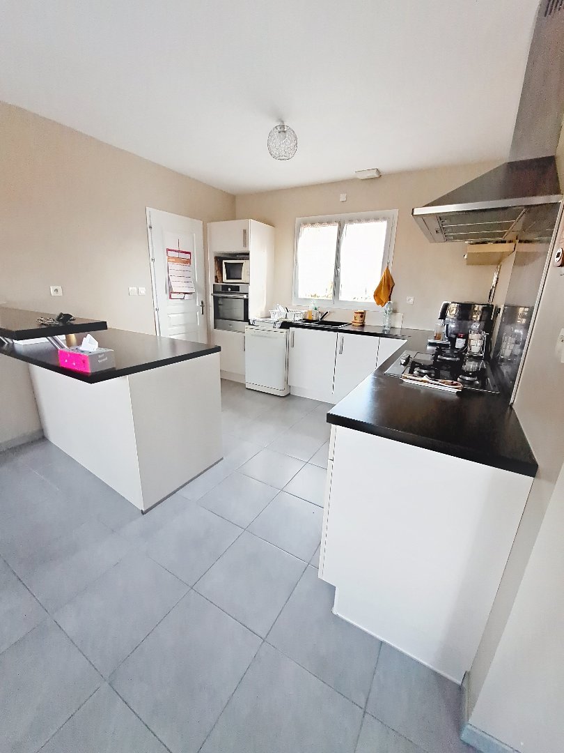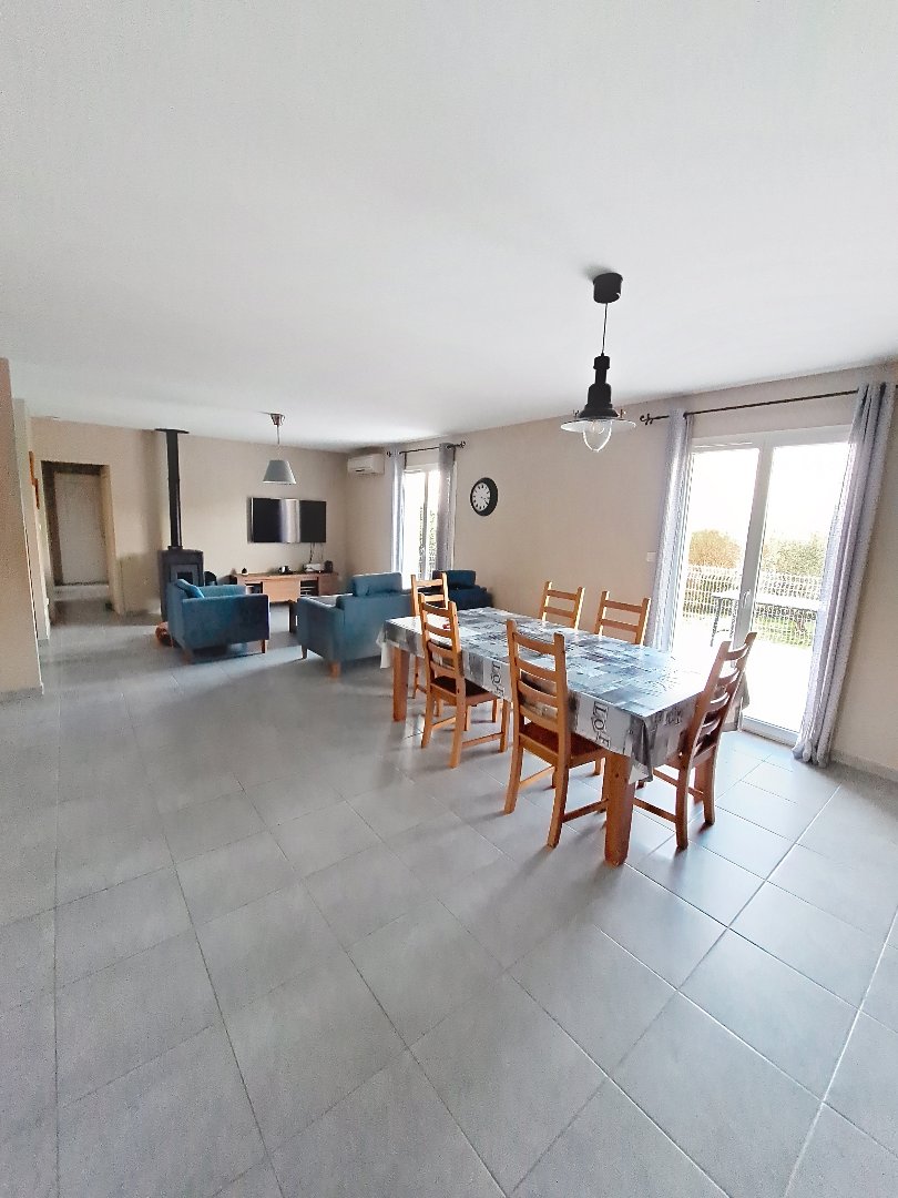 Une entrée avec placard s'ouvre sur une grande pièce de vie lumineuse et chaleureuse avec son poële à granules. Des grandes portes fenêtres donnent sur une immense terrasse de 40 m² qui invite à profiter de la vue dégagée sur la campagne. La cuisine est spacieuse et ouverte sur le salon et l'on apprécie son bar à breakfast.