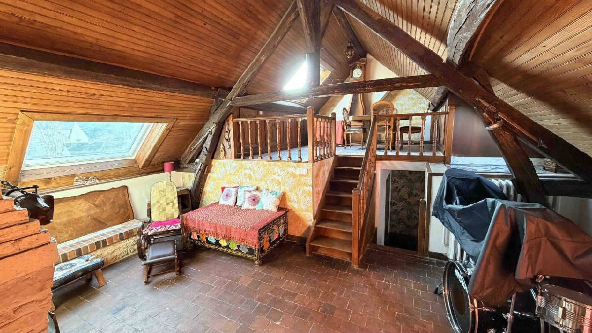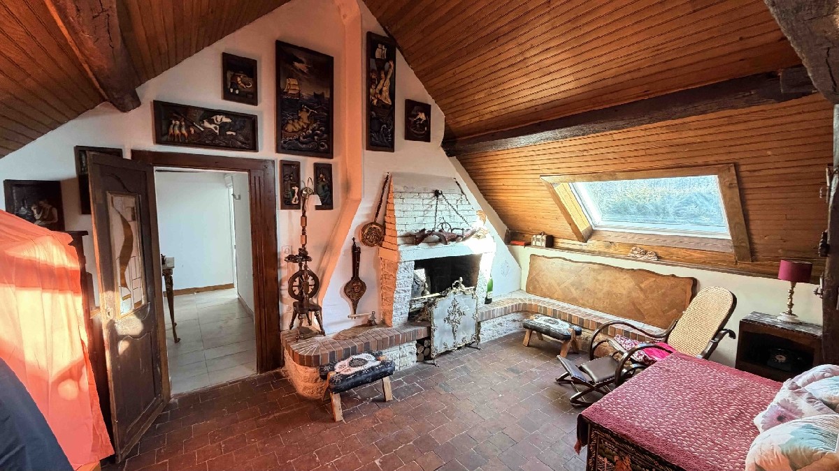 A l'étage : 3 chambres dont une avec toit terrasse, mezzanine, salon d'étage avec cheminée, salle de bains, wc.