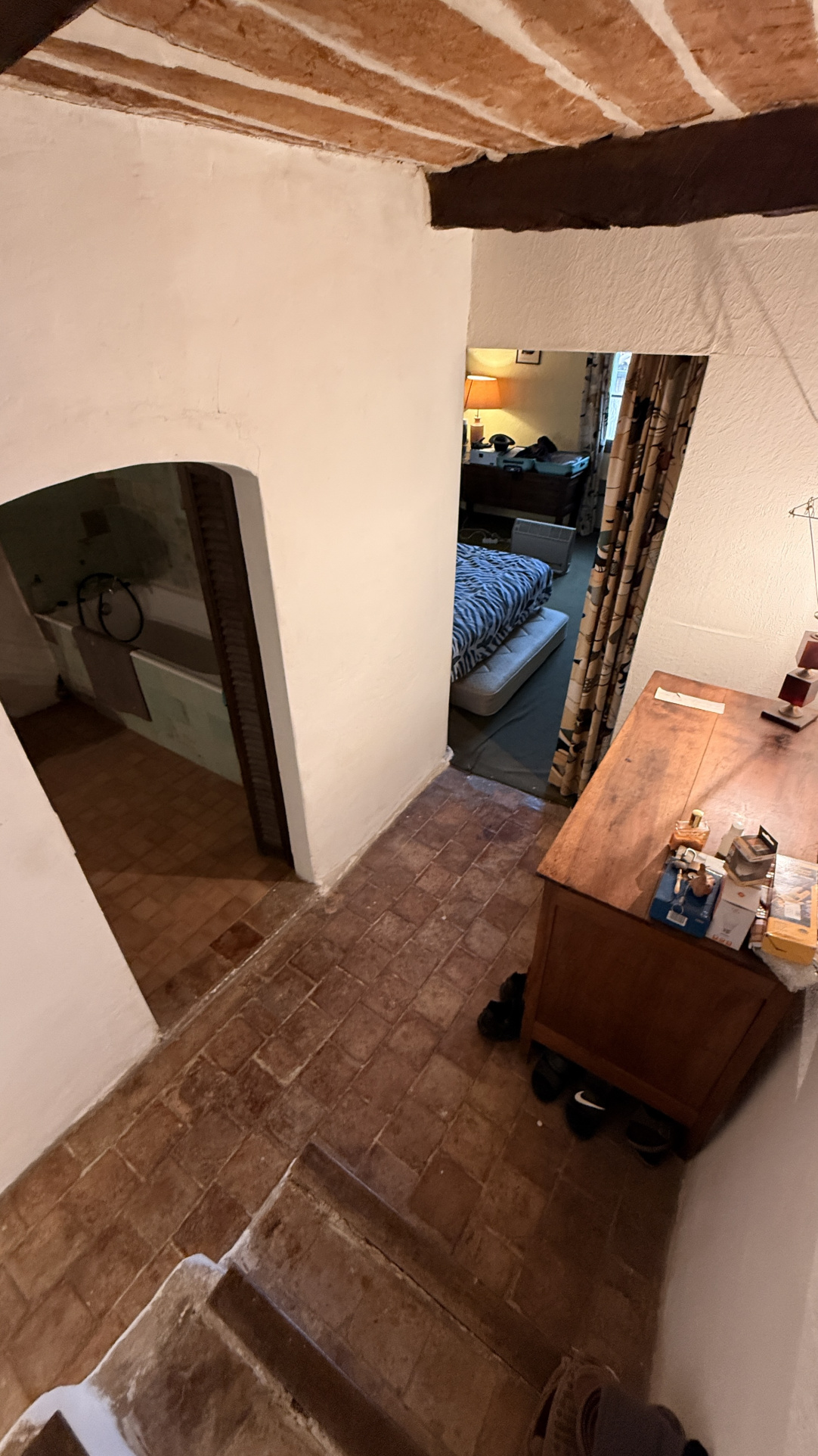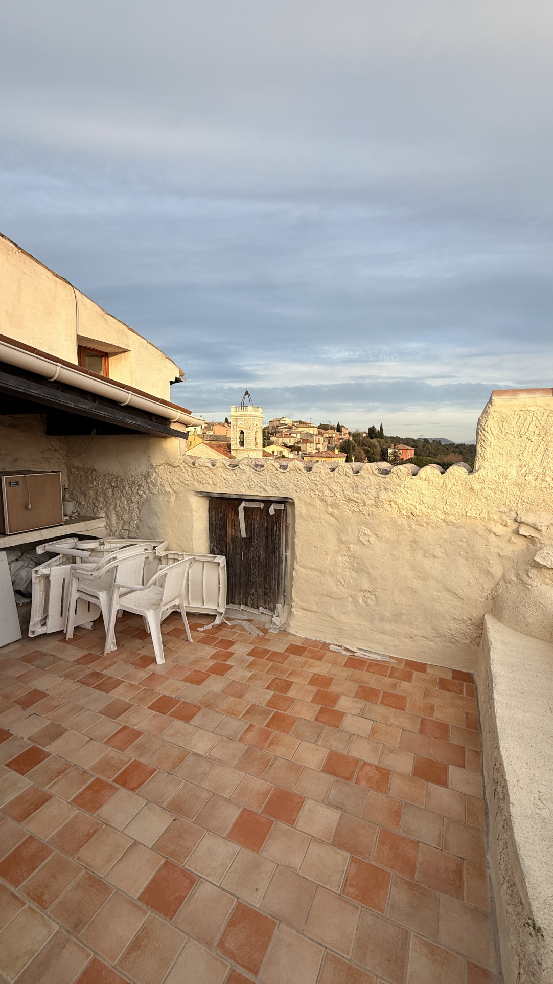 3e étage : 1 chambre avec une douche, un lavabo et 1 WC, une mezzanine (couchage) puis une terrase avec lavabo et barbecue à bois et vue me + le village de La Gaude (haut et bas) (expo SUD-EST)