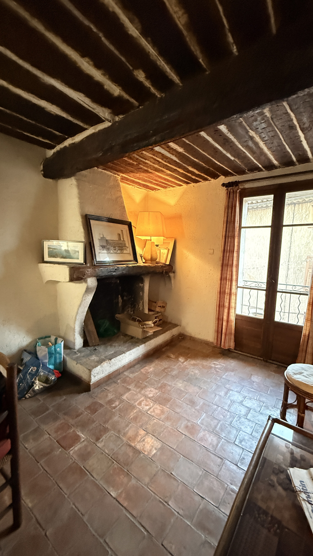 1e étage : belle pièce de vie avec une cuisine à l'ancienne ouverte sur un salon avec une cheminée, un balcon (expo EST)