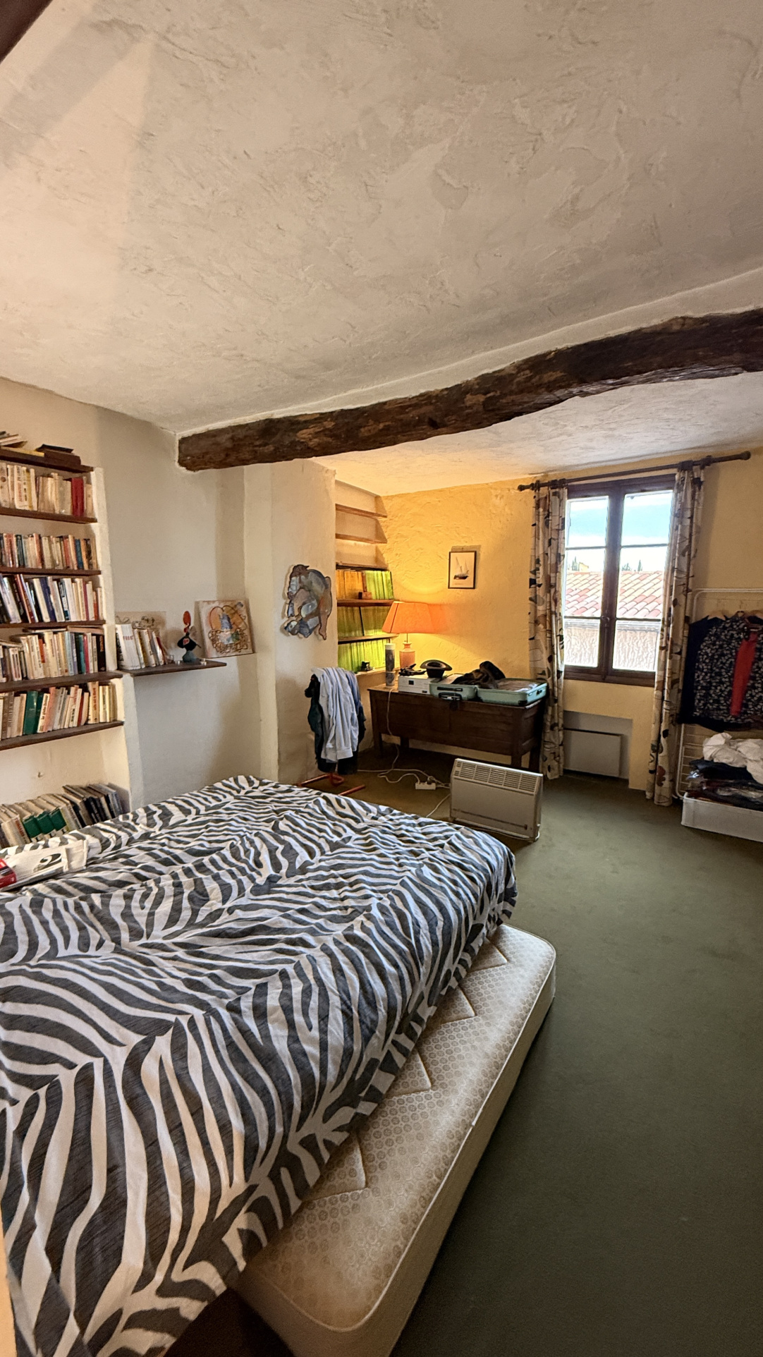 2e étage : grande chambre avec un grand nombre de placards et fenêtre vue sur le clocher et aperçu mer
