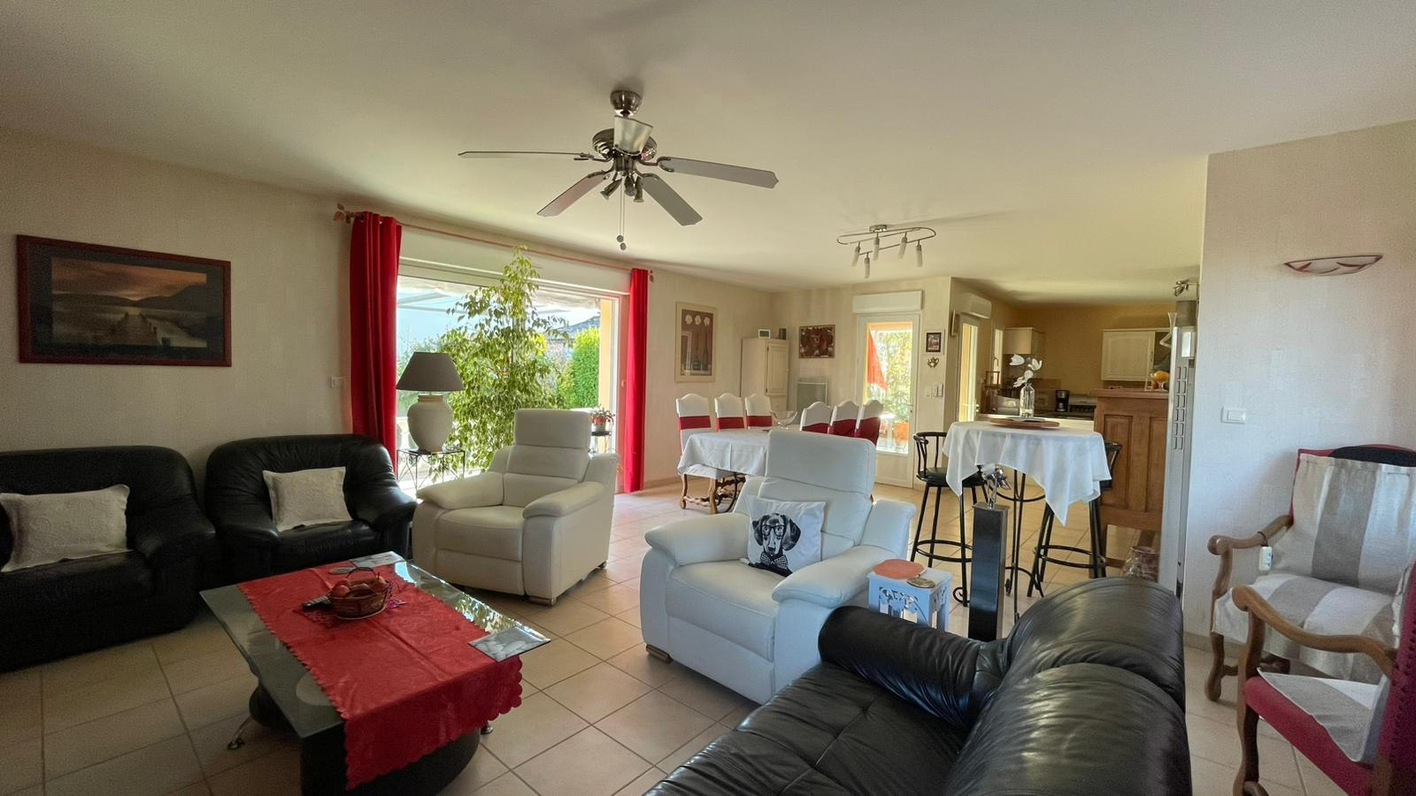 Au rez-de-chaussée : entrée, dégagement, vaste séjour avec cheminée/insert ouvrant sur terrasse de 26 m2, jardin et auvent fermé de16 m2, cuisine à l'américaine entièrement équipée, cellier, salle d'eau, WC séparés, deux chambres dont une avec placard.