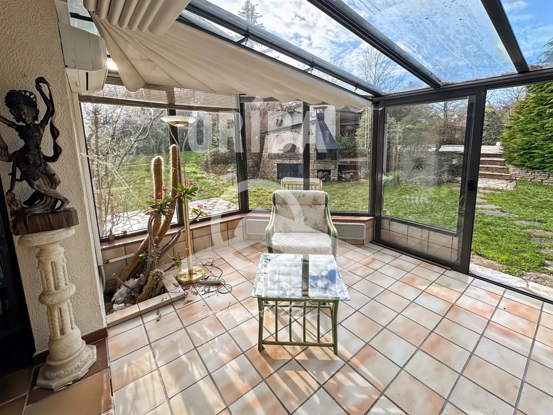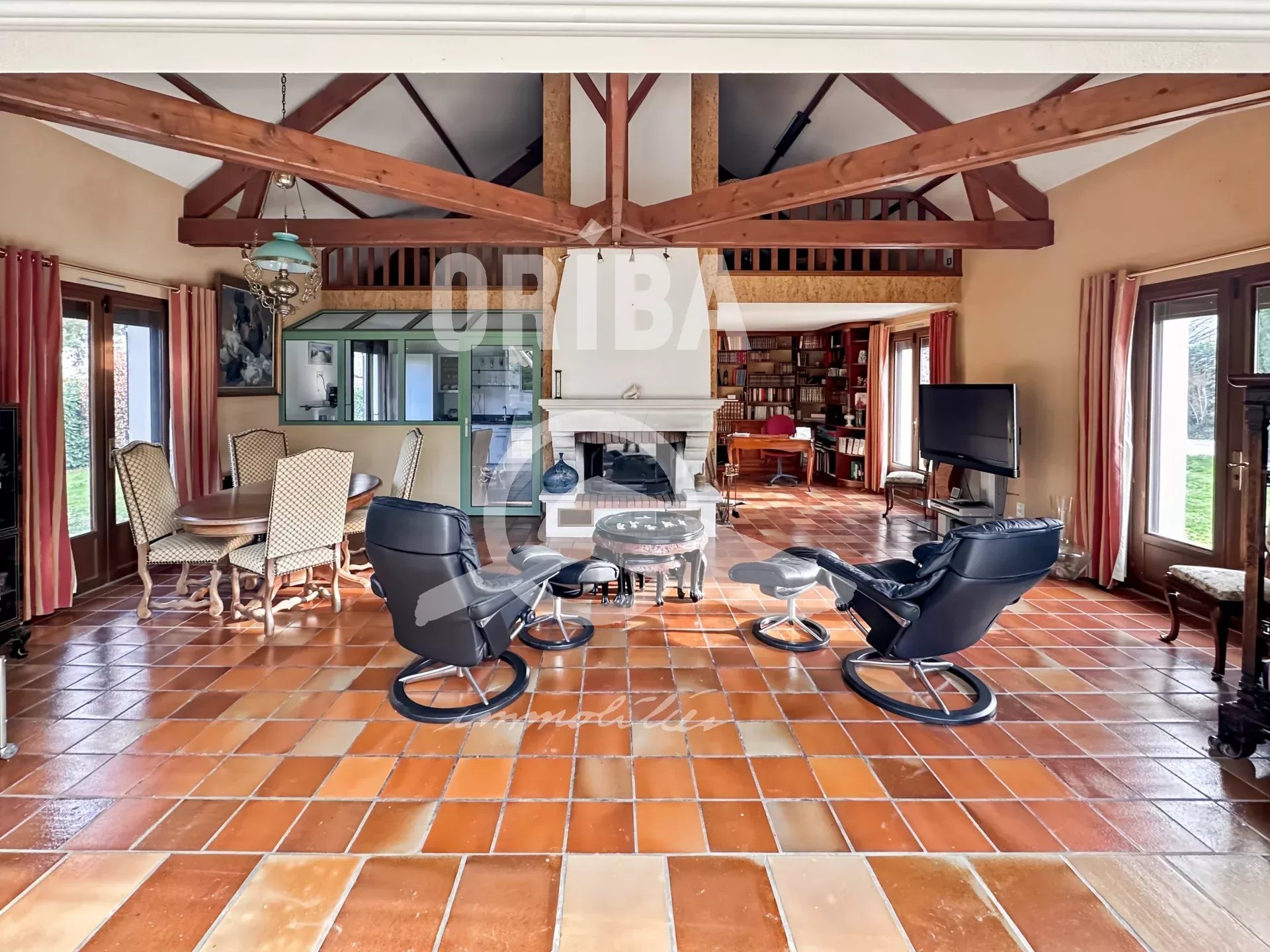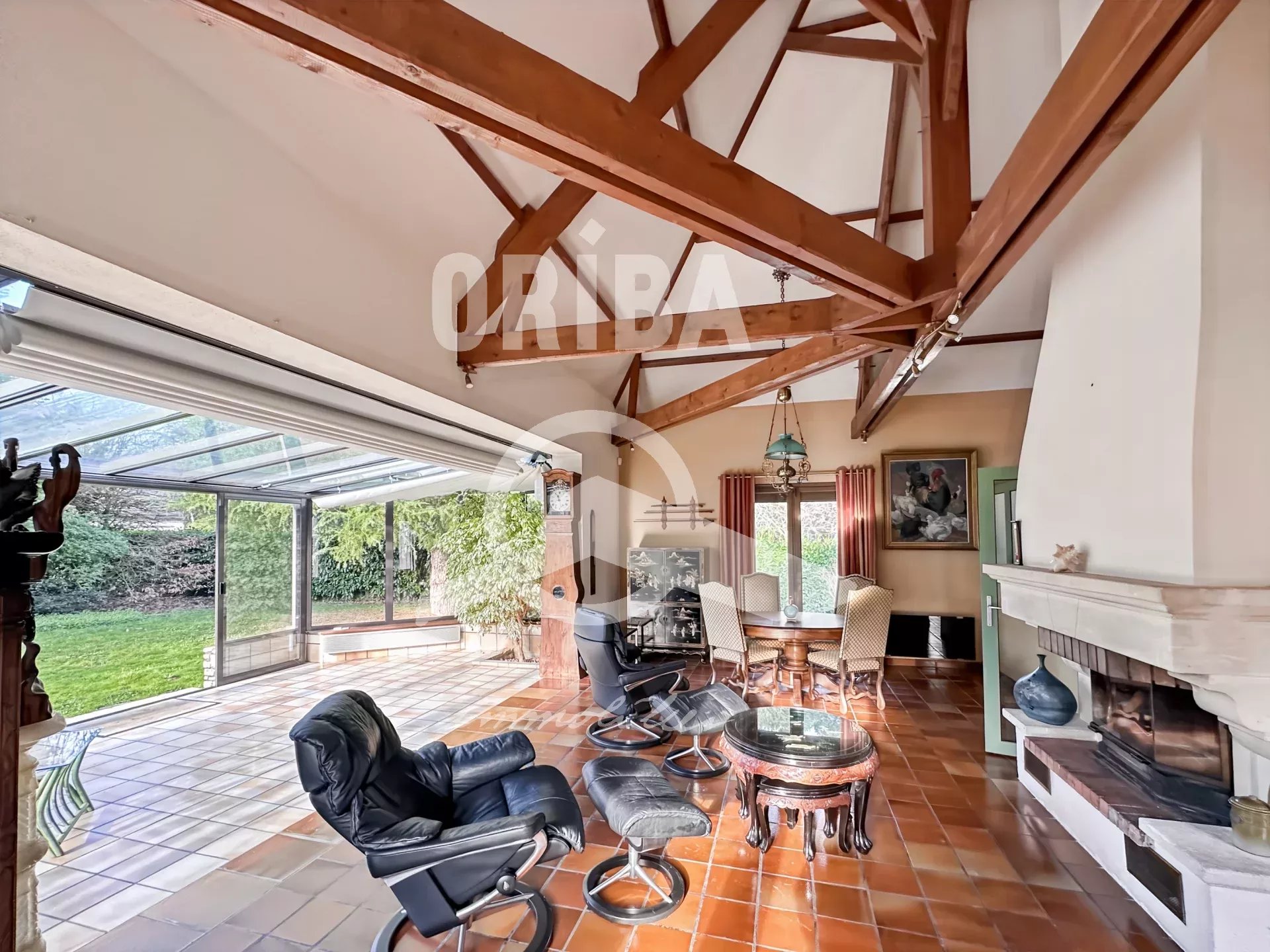 • Une très belle pièce de vie de plus de 60 m², comprenant séjour, salon et véranda, sublimée par des poutres apparentes et une cheminée avec insert,