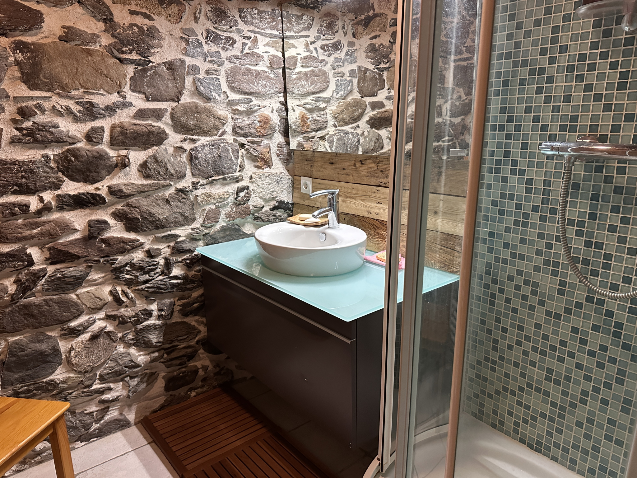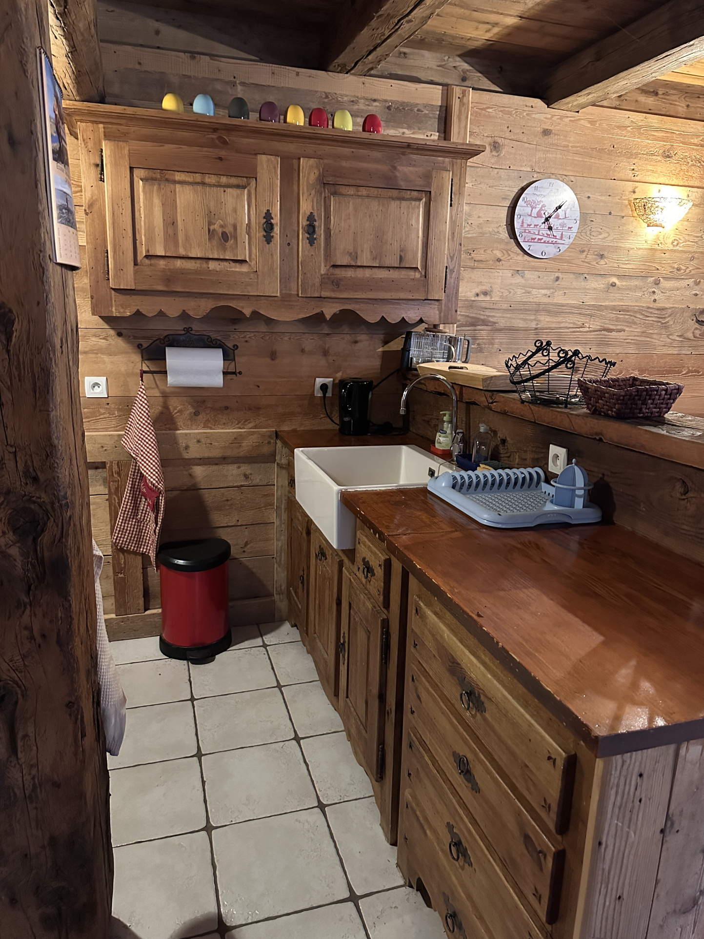 au niveau 1: une entrée, un séjour avec cuisine, une chambre, une salle d'eau avec WC, et un escalier intérieur amenant à l'étage supérieur. La terrasse en bois devant le chalet est l'accès principal à l'entrée du chalet.