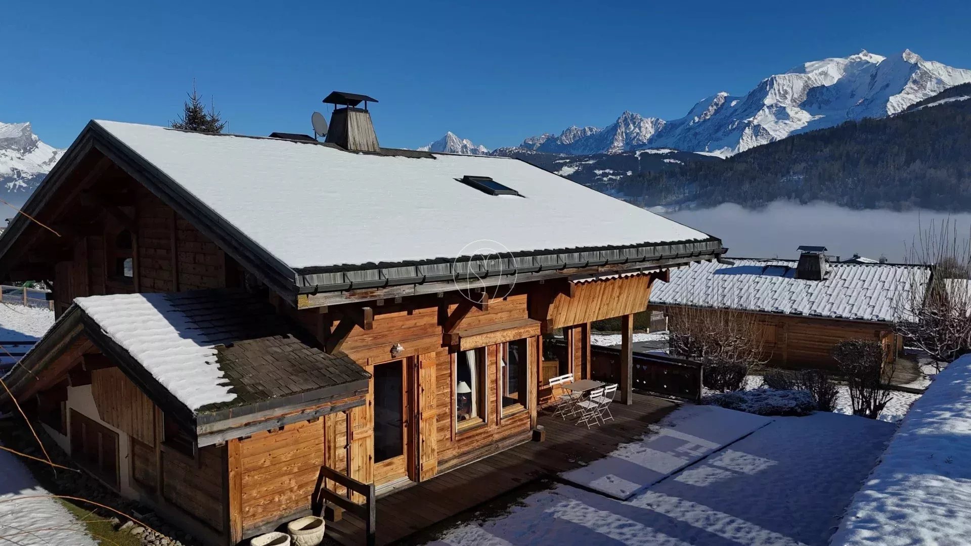 À l'étage principal, une pièce de vie ensoleillée avec cheminée et cuisine séparée. Depuis cet espace, vous accédez à une terrasse orientée Sud-Est offrant une vue imprenable sur le Mont-Blanc, ainsi qu'à un grand jardin. Une chambre en suite avec sa salle de bains privative complète ce niveau.