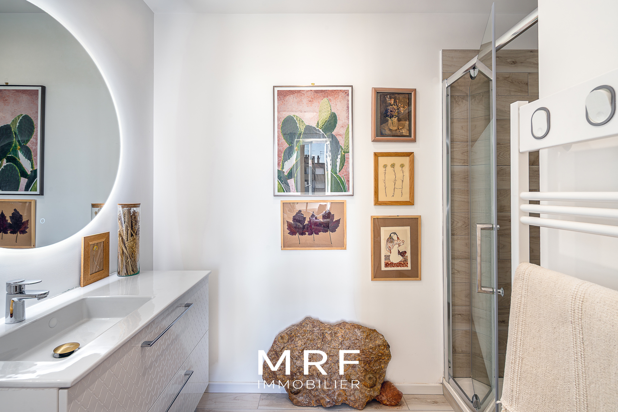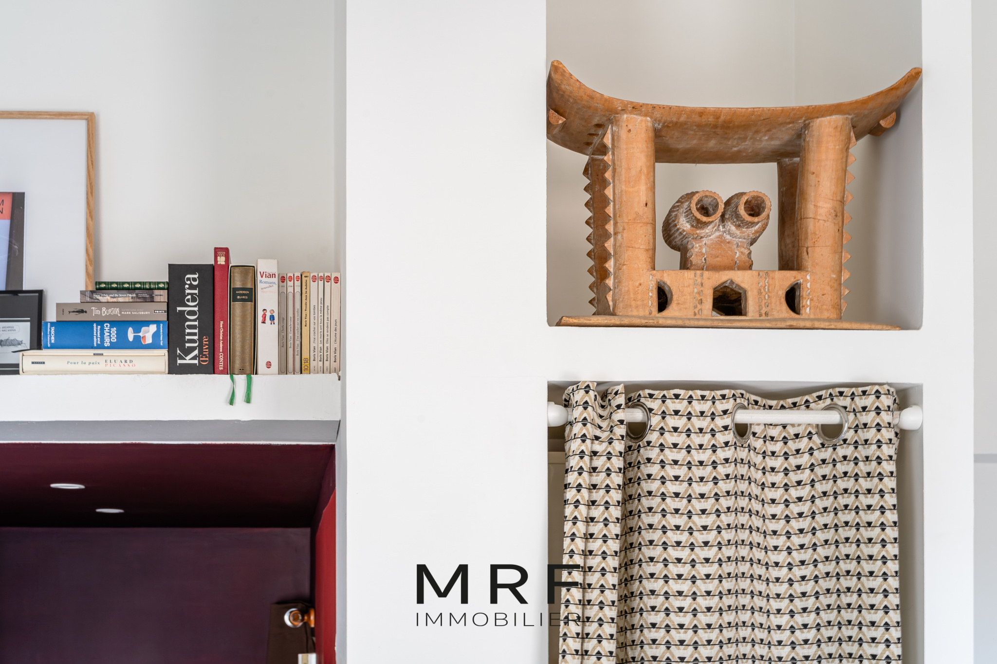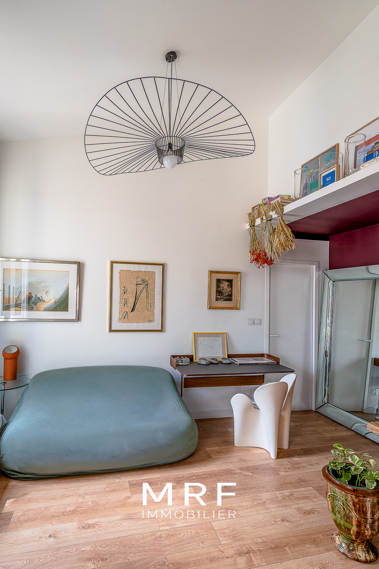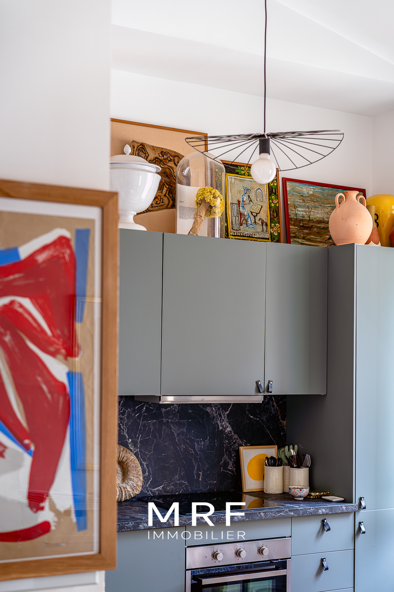 Dès l'entrée, la lumière s'invite généreusement et met en valeur une décoration subtilement orchestrée, où meubles chinés et pièces contemporaines dialoguent avec harmonie. L'atmosphère, à la fois chaleureuse et singulière, évoque celle d'un intérieur de collectionneur où d'un esprit créatif. La hauteur sous plafond confère à la pièce de vie une ampleur aérienne et apaisante. Elle ouvre sur une cuisine aux tonalités sobres et se pare d'un parquet clair qui accentue la luminosité et renforce le sentiment de quiétude.
