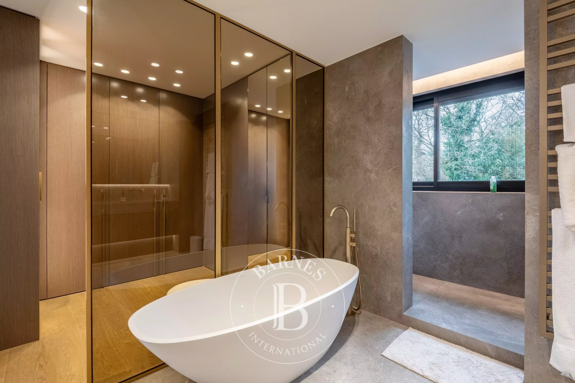 Elle se compose au rez-de-chaussée d'un hall d'entrée spacieux, d'une grande pièce de vie centrale avec un espace salle à manger et d’une grande cuisine totalement équipée haut de gamme, sur mesure.