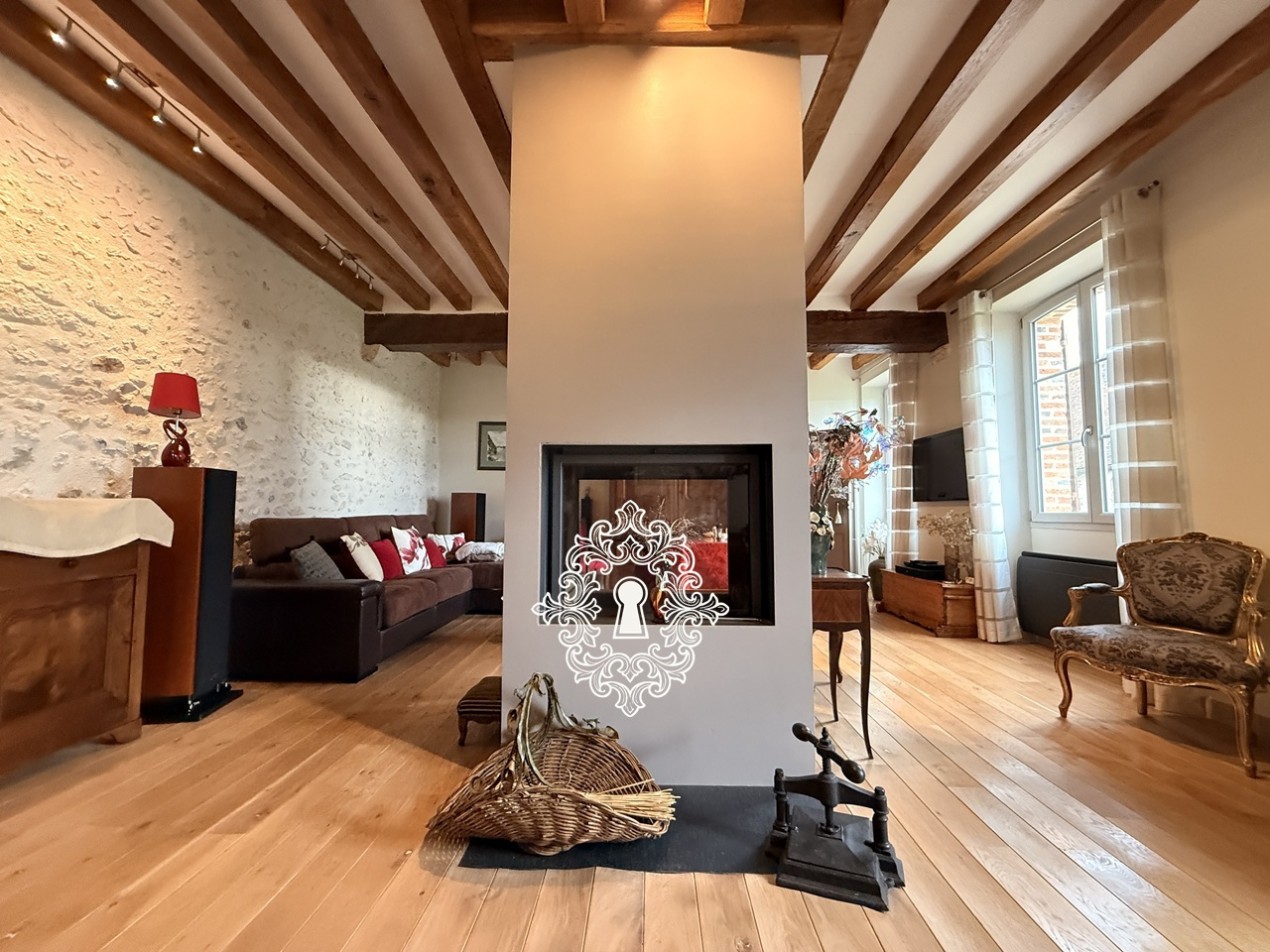 entrée, séjour 44 m2 (cheminée centrale avec insert), cuisine ouverte aménagée et équipée, salle à manger (cheminée), arrière-cuisine, chambre parentale avec salle d'eau et wc, buanderie, cave,