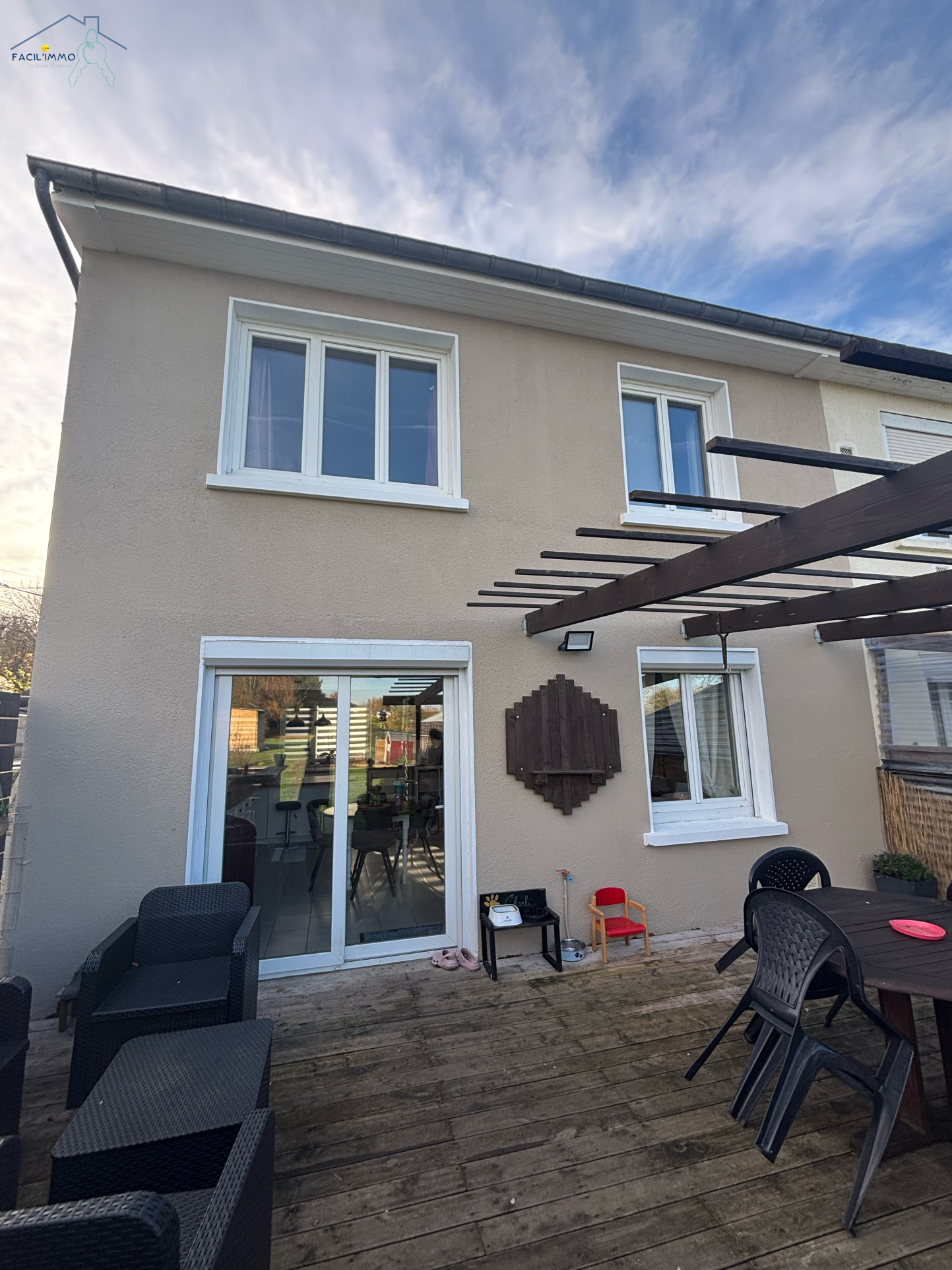 Un jardin clos , une terrasse avec pergola ,abri de jardin , parking intérieur et exterieur,sous sol avec coin buanderie.