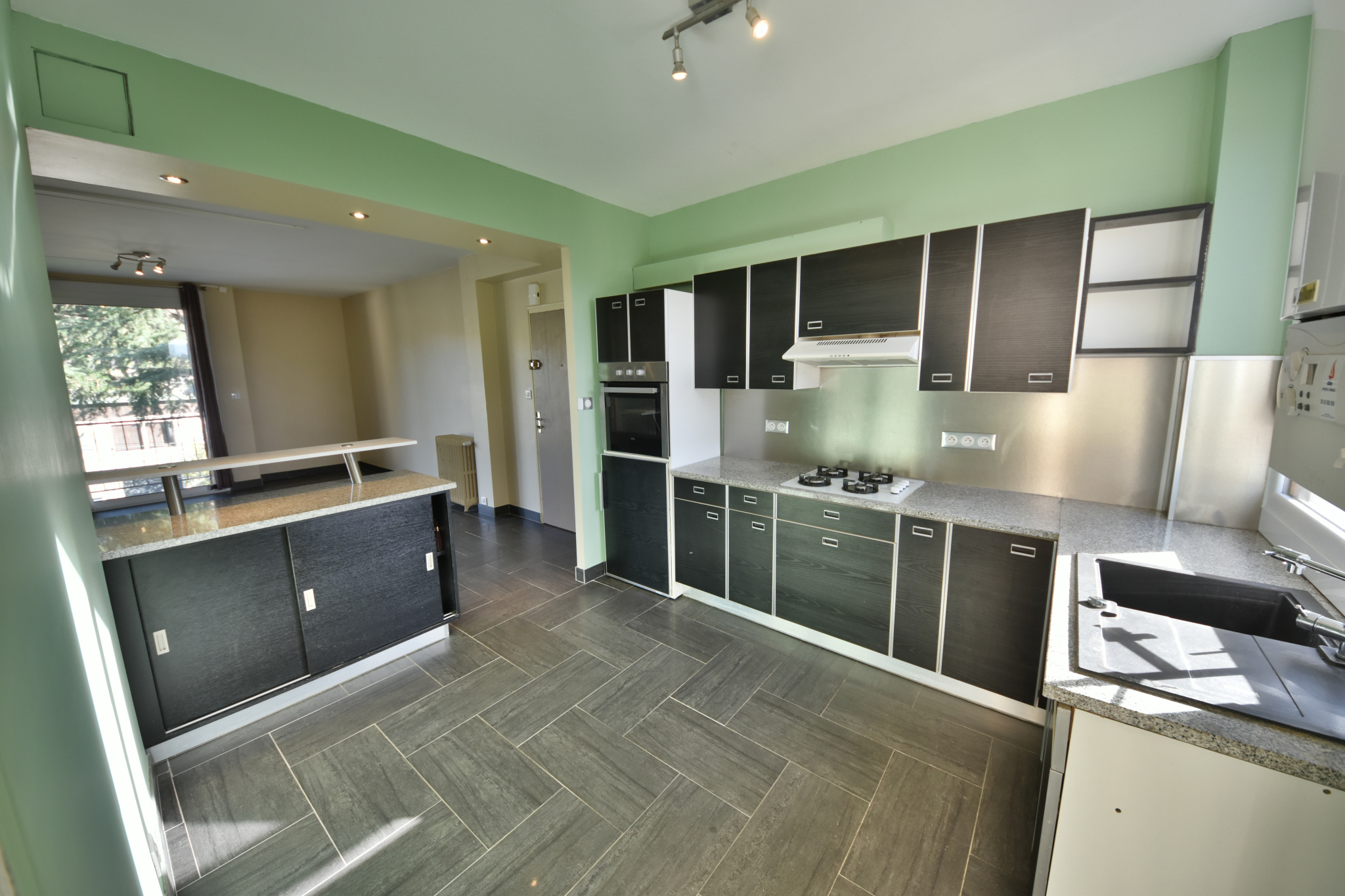 Ce logement traversant et lumineux est composé : salon/séjour/cuisine (environ 45 m2), dégagement (rangements), salle de bains, 2 chambres et WC indépendant.