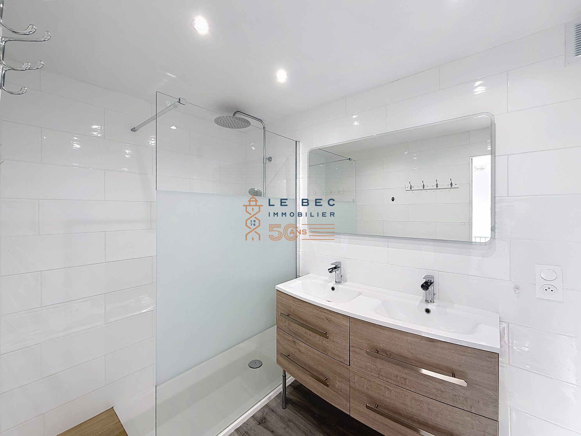 Elle se compose au rez-de-chaussée d'une entrée, d'un salon-séjour avec cuisine ouverte, orienté vers une terrasse exposée sud-ouest, d'une chambre avec salle d'eau attenante, d'un WC, d'un placard de rangement, un cellier ainsi qu'un garage.