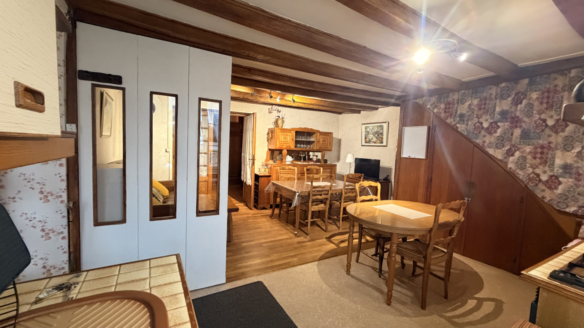 La maison se compose de: 1Entrée sur véranda,1Pièce de vie avec cuisine, salle à manger et salon,1 chambre,1Salle d'eau + WC, À l'étage :1 bureau / chambre d'appoint,2 chambres. Avec un mode de chauffage neuf posé en 2025 chaudière à granulés avec radiateur bitubes et silo de stockage programmable a distance.