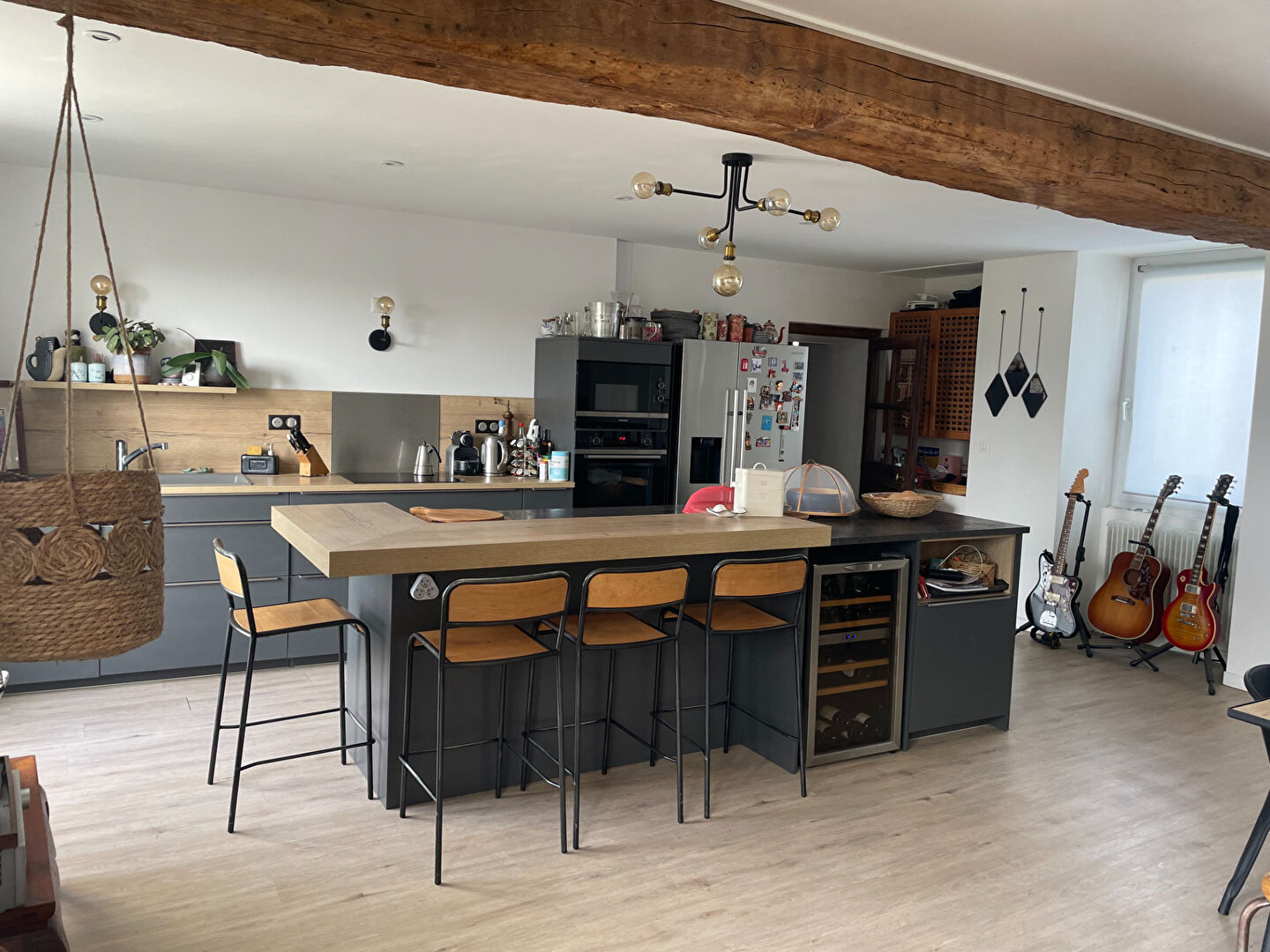AU RDC une entrée, Cuisine AE ouverte sur large salle à manger, chambre, wc et lave mains