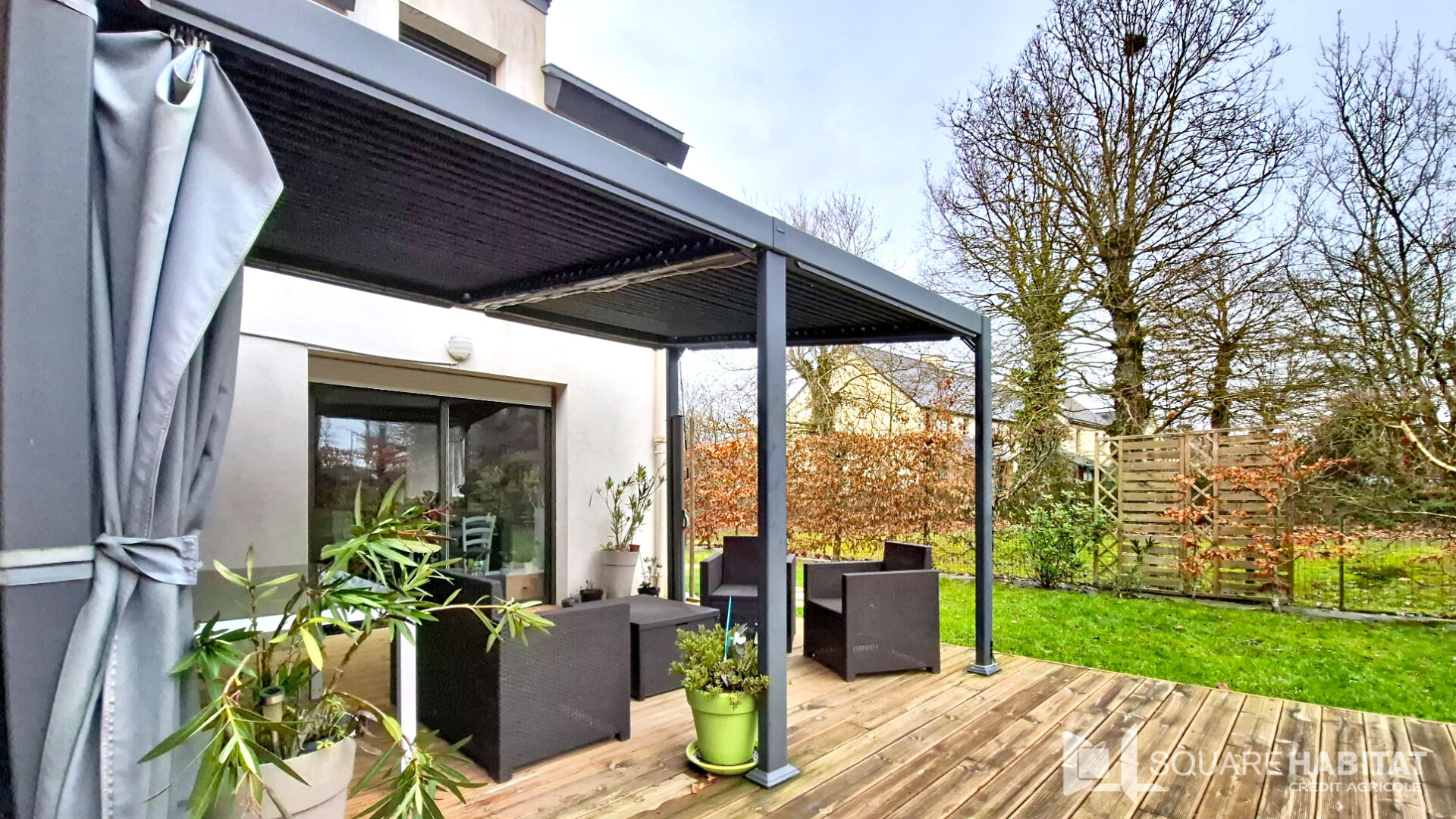 Un espace extérieur convivial avec sa belle terrasse en bois, sa pergola qui laisse place à la détente.