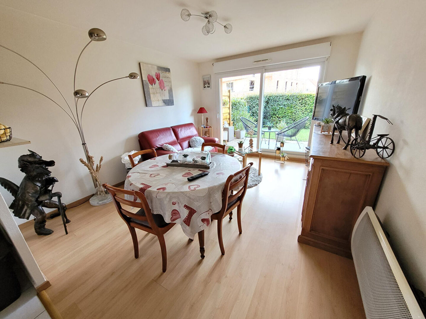 Ce T2 se compose d'un grand hall d'entrée avec cabine pouvant accueillir un clic clac, d'un séjour ouvert sur sa cuisine équipée , une chambre , une salle de bain , un wc , une terrasse de 11M² + un jardin d'environ 40M², et enfin une place de parking privative .