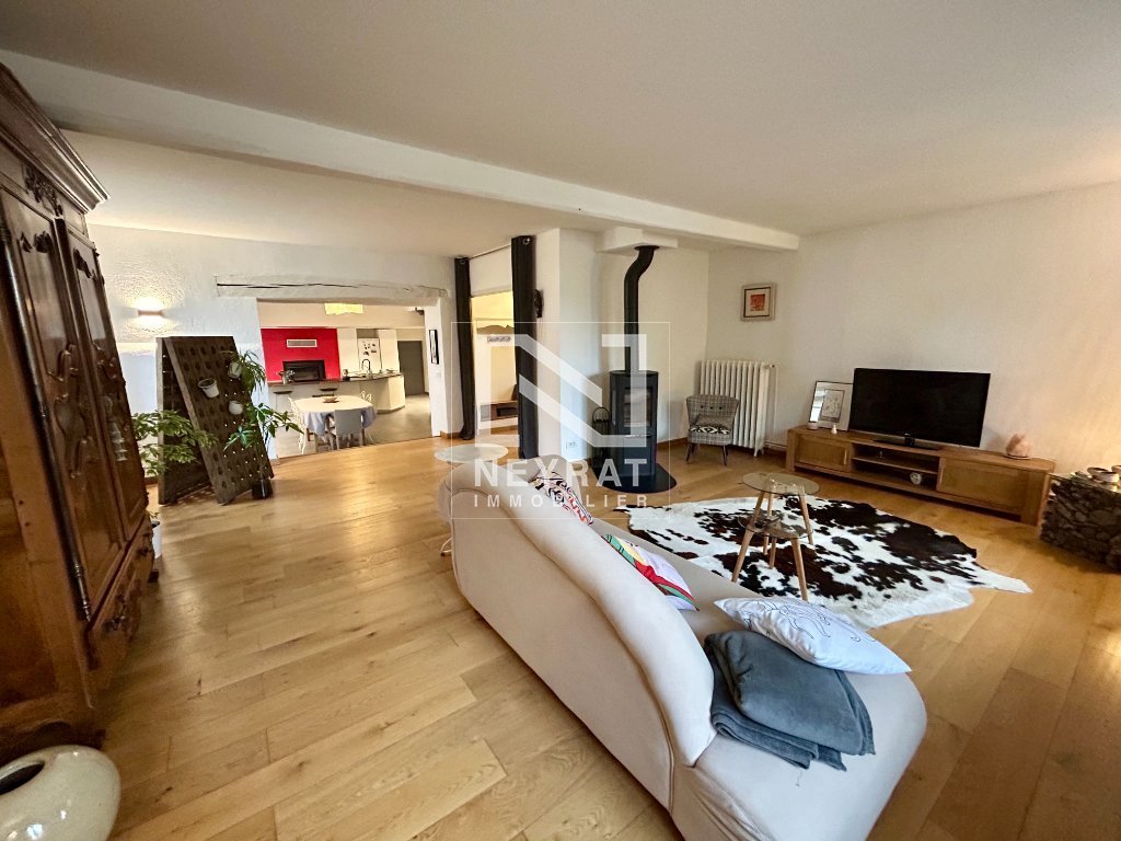 Le vaste salon lumineux, équipé d'un poêle à bois moderne, vous invite à la détente.