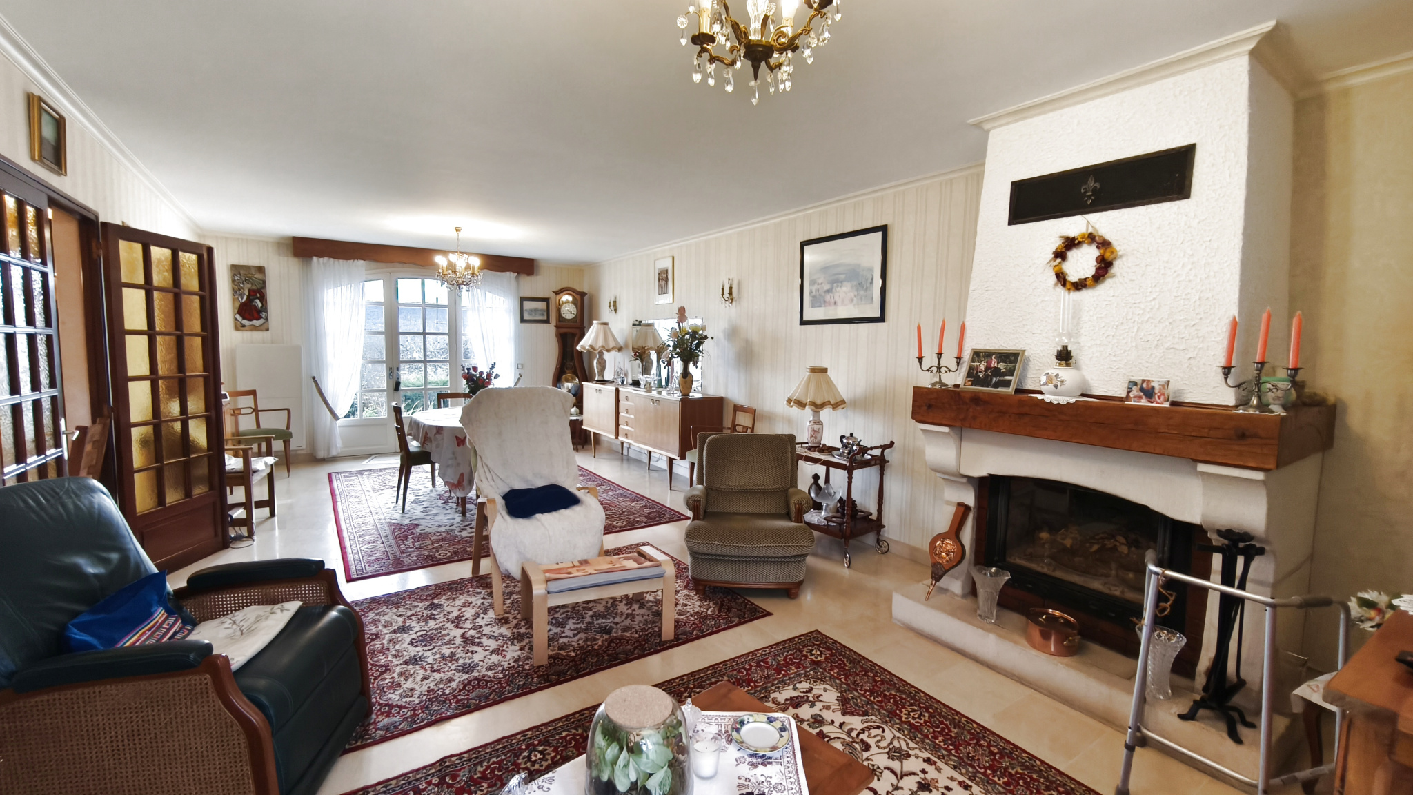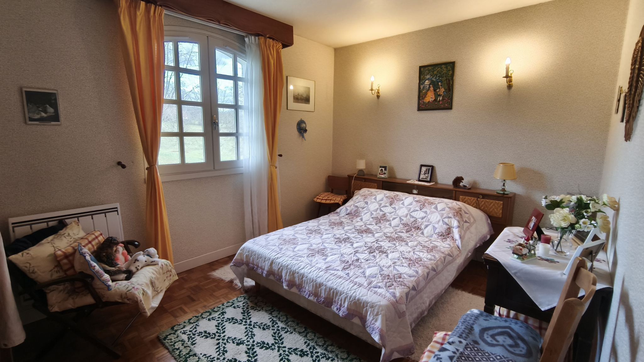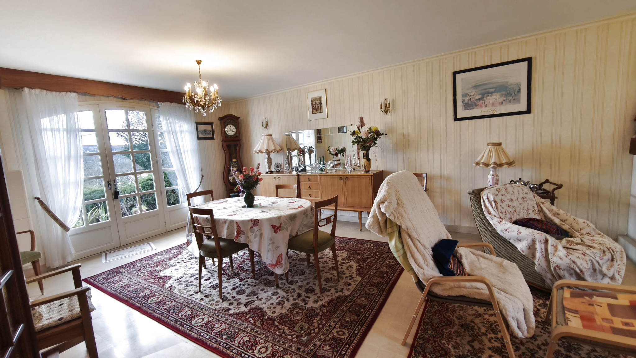 A proximité immédiate du bourg et de ses commerces, dans un environnement calme et verdoyant, cette belle maison des années 80, élevée sur sous-sol complet, comprend :