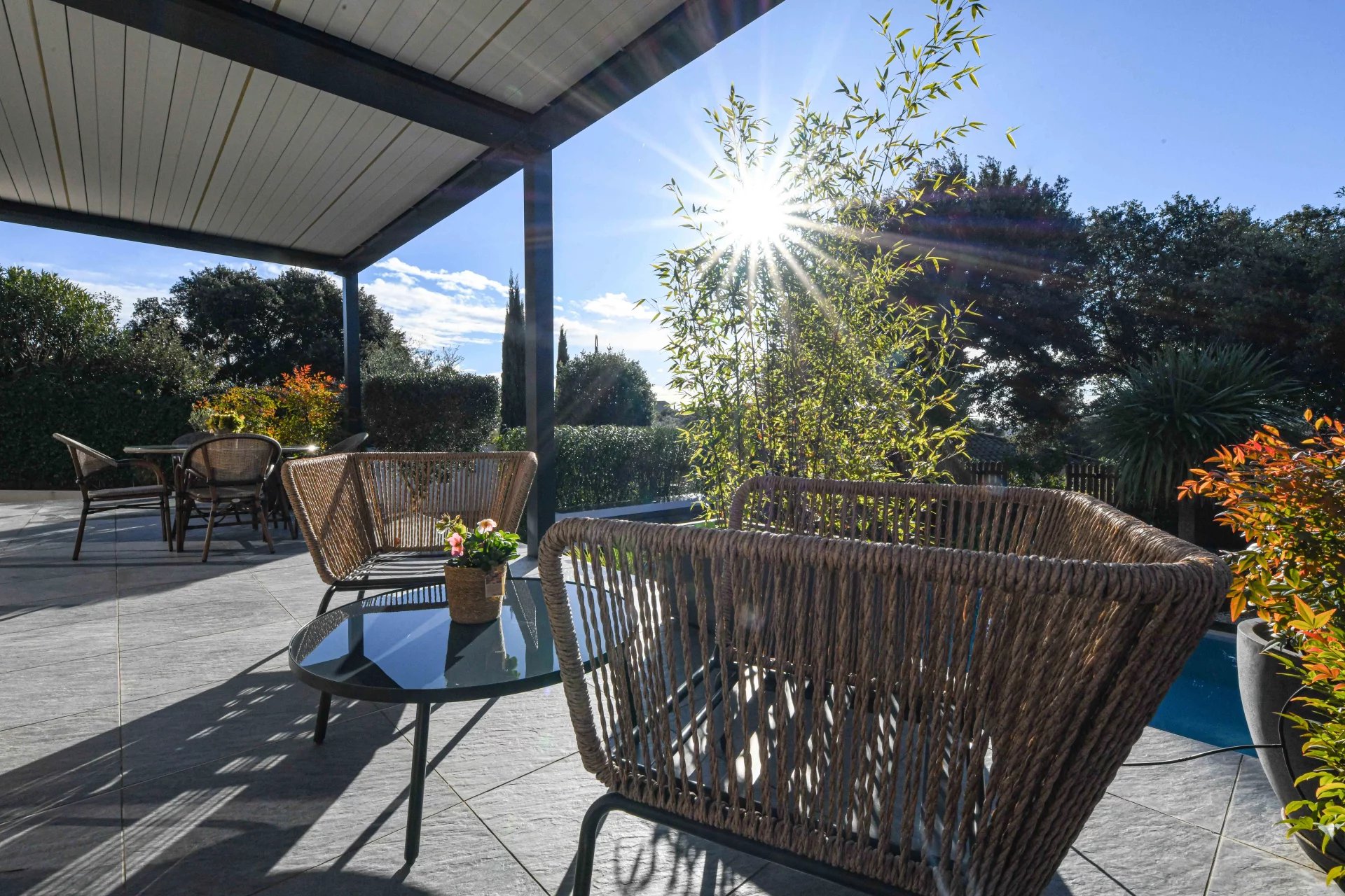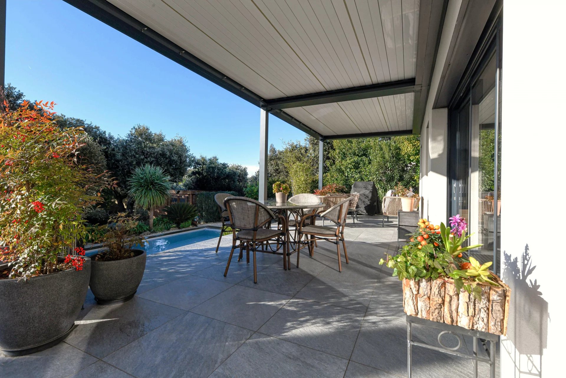 Superbe jardin paysager entourant la propriété avec piscine