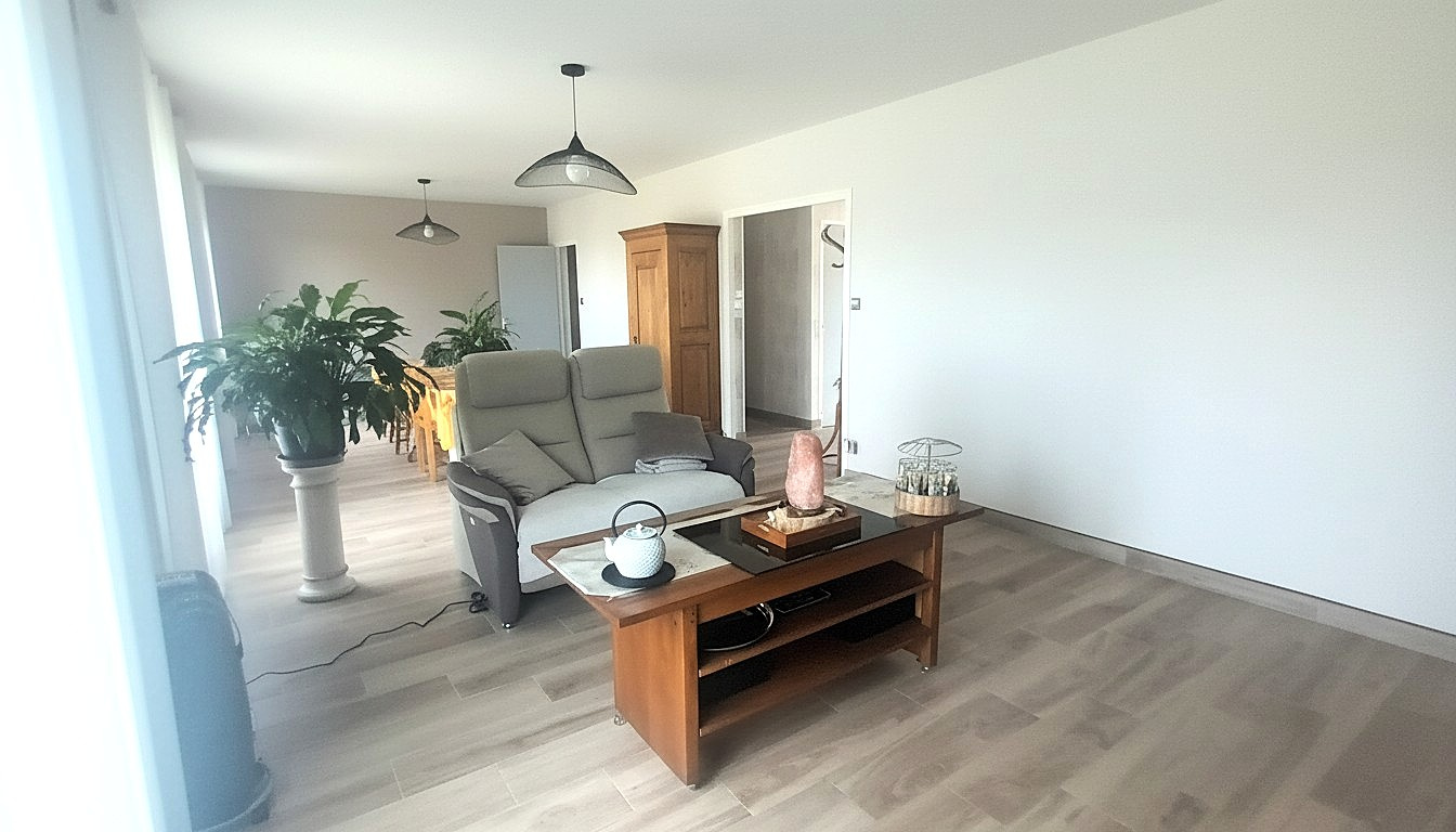 Un séjour-salon spacieux avec poêle à bois donnant sur terrasse sans vis à vis.