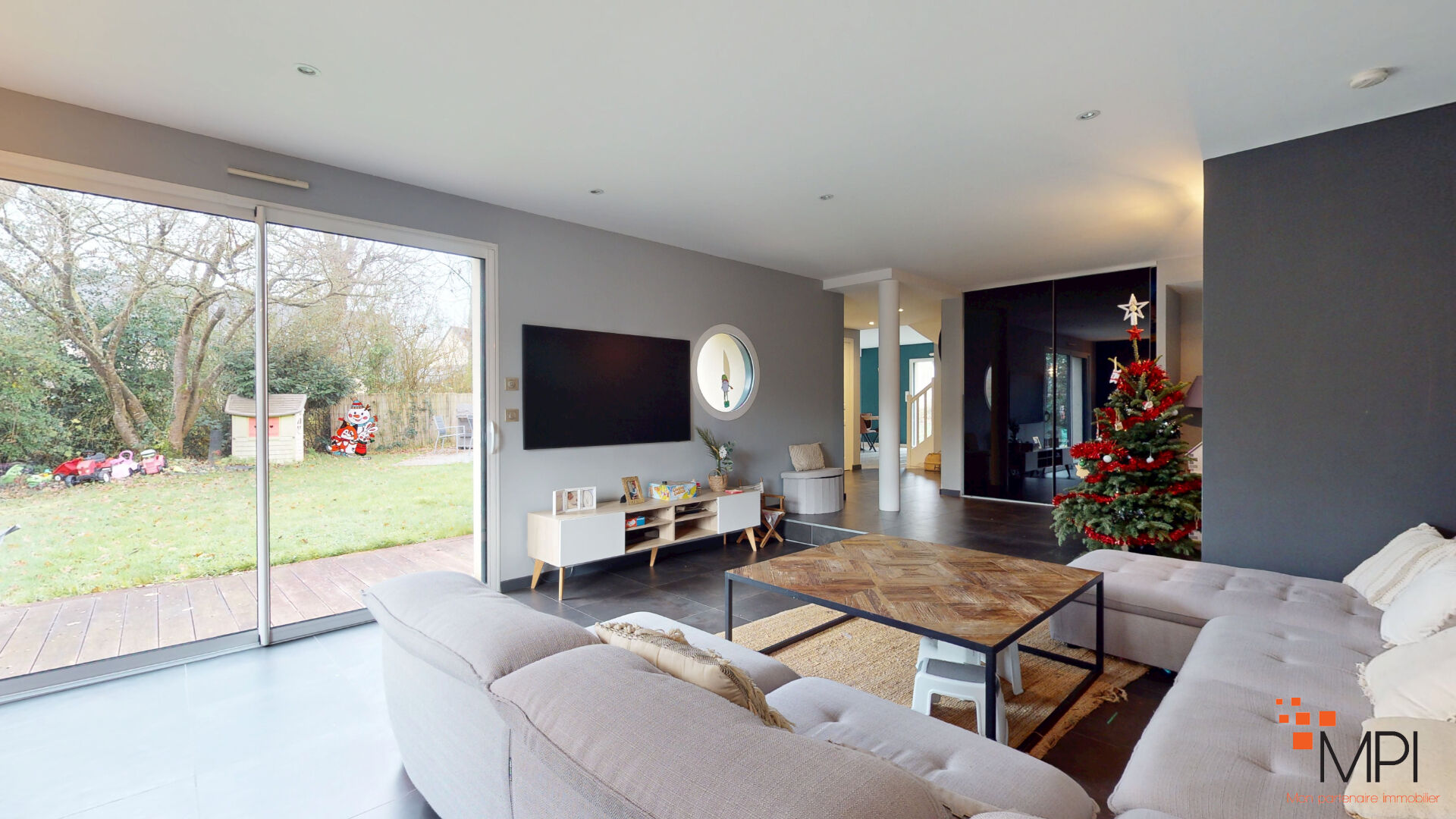 La salle à manger, largement ouverte sur la terrasse et le jardin, prolonge naturellement l'espace intérieur vers l'extérieur et permet de profiter pleinement d'un jardin intime, arboré et sans aucun vis-à-vis, véritable havre de paix propice aux moments de détente, aux repas en extérieur et aux instants partagés en famille ou entre amis, tandis qu'un grand salon indépendant offre un volume supplémentaire, idéal pour créer un espace plus cosy ou un lieu de réception distinct.