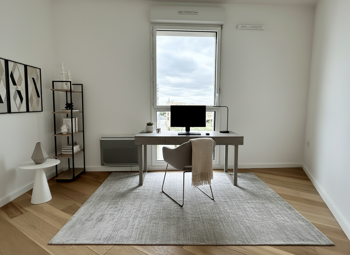 Il offre un hall d'entrée avec placard, un séjour avec cuisine équipée et ouverte (plaque, hotte, four) avec espace repas, donnant sur un balcon exposé Sud-Est, une chambre de 12m² et un bureau/chambre d'enfant de 8m², une salle de bains avec WC. Également une place de parking couverte et sécurisée.
