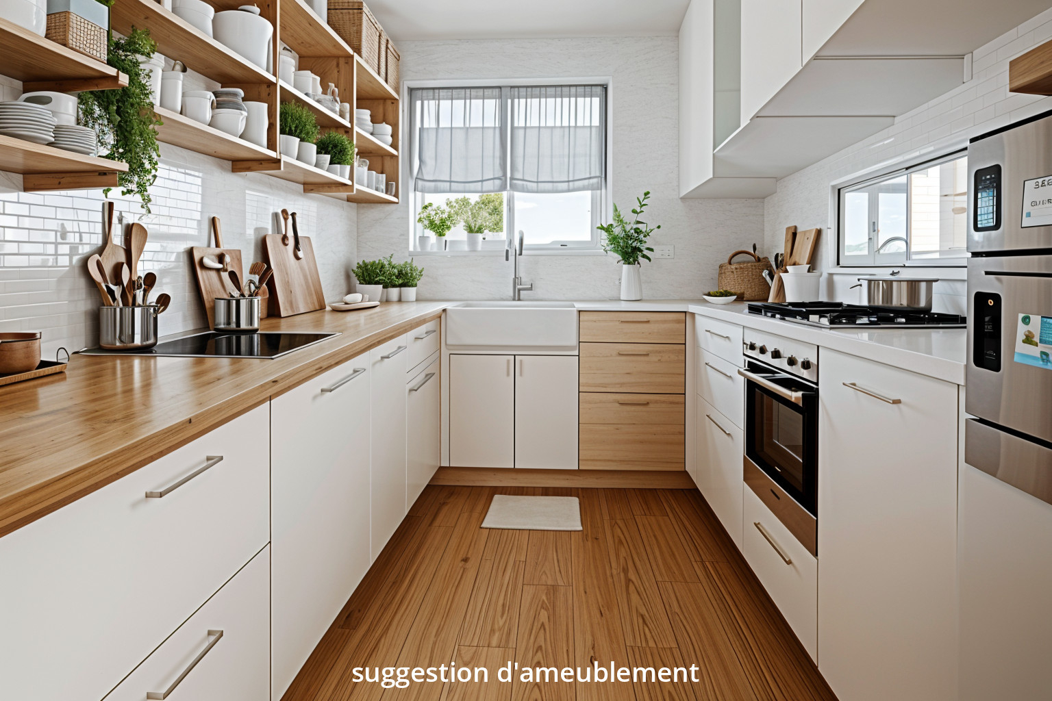 Le rez-de-chaussée offre une entrée ouvrant sur une vaste pièce de vie traversante de plus de 40 m², baignée de lumière, regroupant un salon-séjour sur parquet avec cheminée et une cuisine aménagée et équipée.