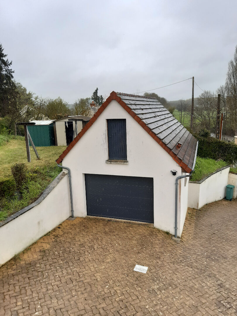 Garage avec porte motorisée offrant un accès au grenier et à la cave.