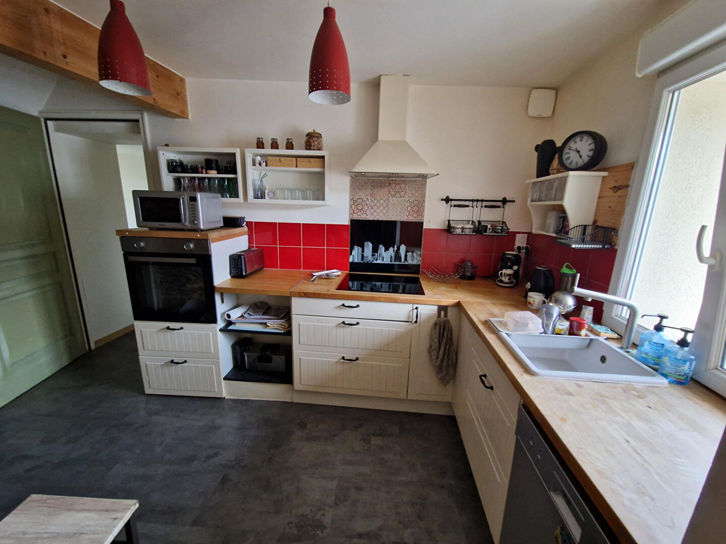 Un salon chaleureux agrémenté d'un poêle à bois, une salle à manger lumineuse ouverte sur la terrasse, une cuisine aménagée fonctionnelle et orientée Sud, une pièce d'eau avec WC indépendant, une pièce de rangement pratique pour le quotidien.