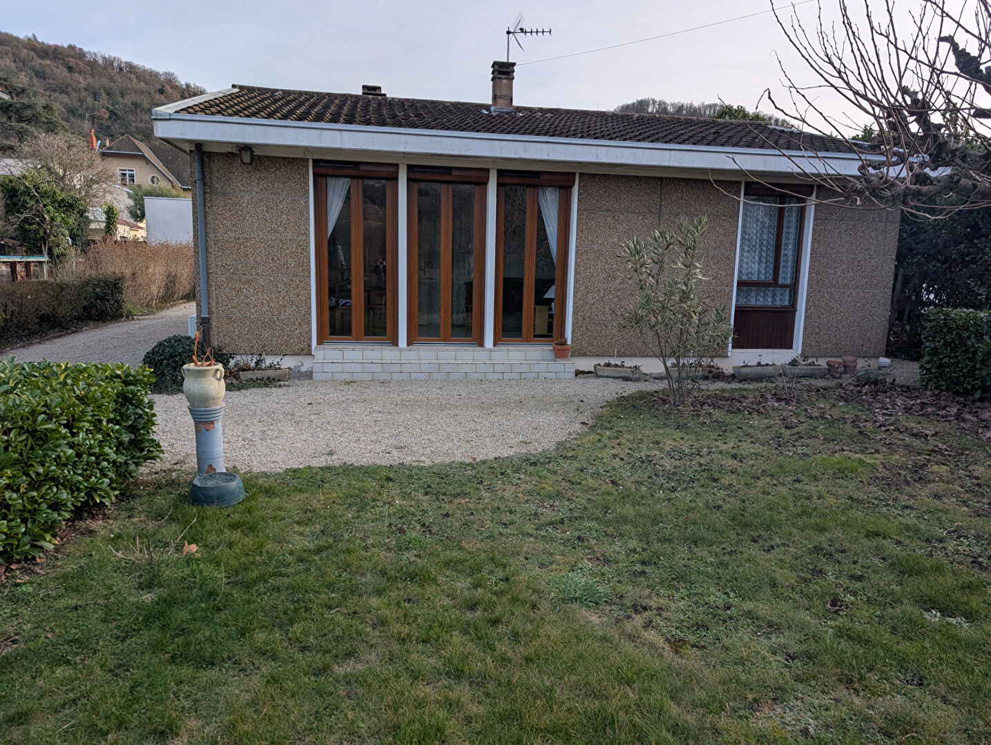 VIENNE - 38200 - Quartier de L'Isle - A proximité immédiate des bus, collège/Lycée et galerie Marchande - PAVILLON de ville - habitation de plain pied de 75 M² habitables édifiée en 1968 - Vaste dégagement central avec placards, salon à l'ouest de 22 M² avec 3 portes fenêtres sur terrasse gravier, cuisine ancienne et aménagée de 7.2 M² , pièce d'eau avec bac à douche, 3 chambres et coin buanderie avec évacuation d'eau - Chauffage gaz radiateur et clim réversible dans le salon - Garage de 22 M² non attenant - Allée de stationnement, agréable jardin plat de 700 M² clos de murettes - Secteur calme - Rafraîchissement à prévoir -