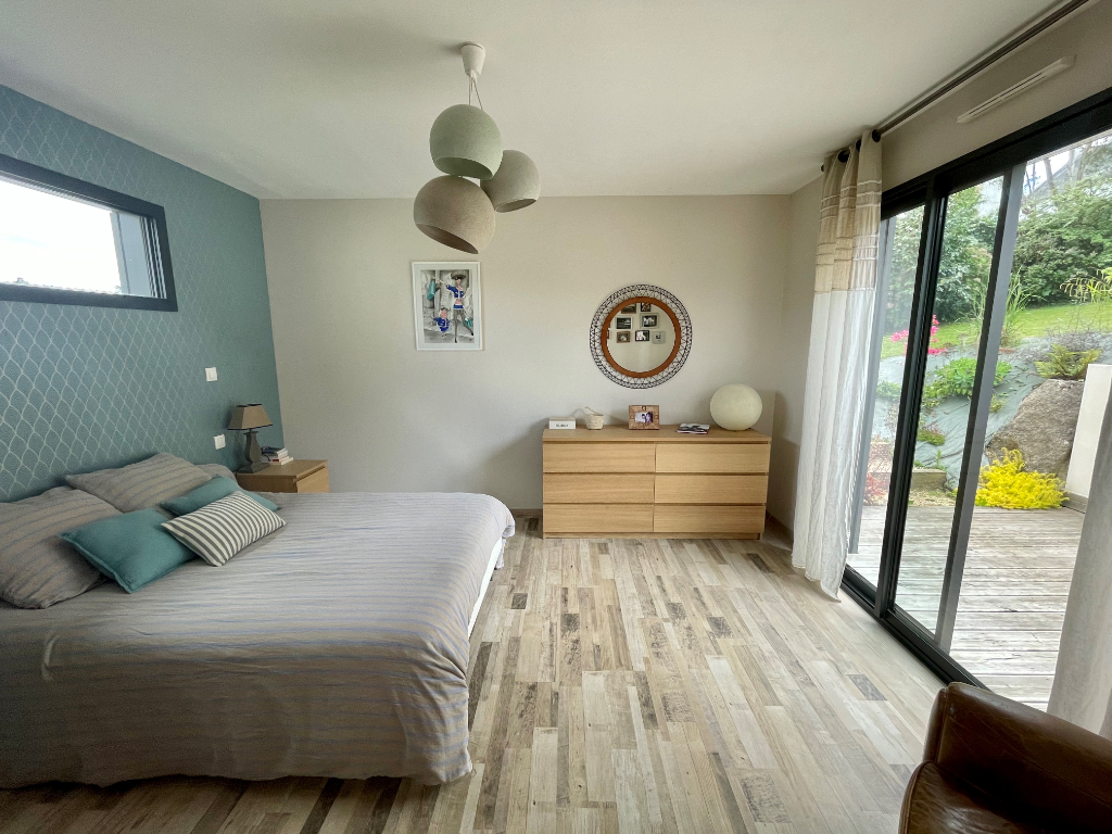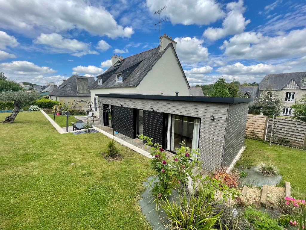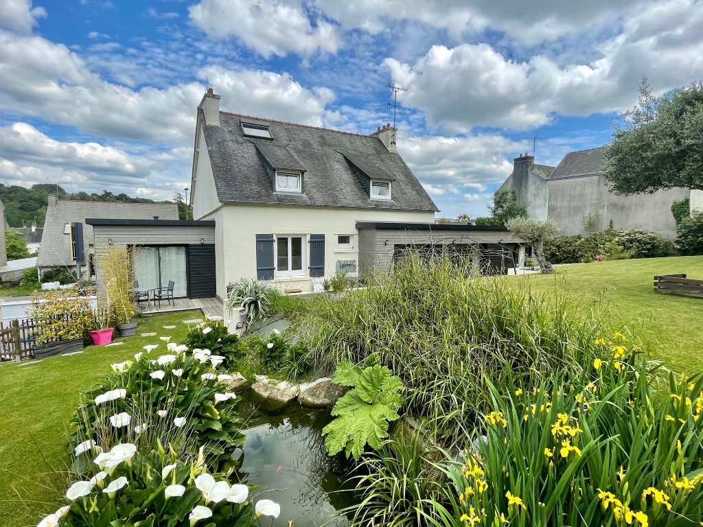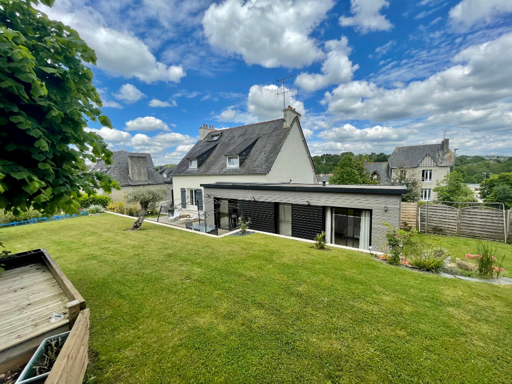 Quimper le Moulin Vert, jolie maison de caractère, rénovée et agrandie par deux extensions en bois, offrant un spacieux séjour salon avec cheminée, cuisine équipée avec son coin repas s'ouvrant sur terrasse bois et son jardin fleuri sur 1016 m², 5 chambres dont 2 suites parentales en rdc avec sde privatives, 3 autres grandes chambres au premier avec sdb. Buanderie et atelier. Centre ville à pieds, bus, écoles et commerces immédiats.