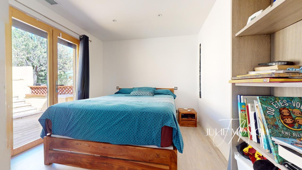 Côté extérieur, deux belles terrasses dont une côté piscine avec une cuisine couverte offrant un panorama entre mer et montagne. La piscine est équipée d'un système de chauffage/refroidissement pour un confort toutes saisons.