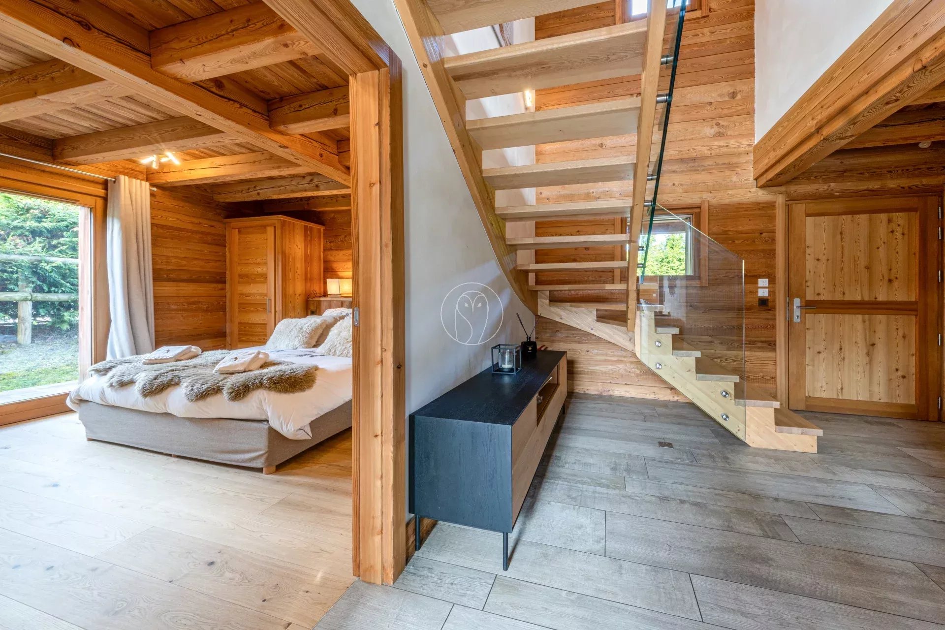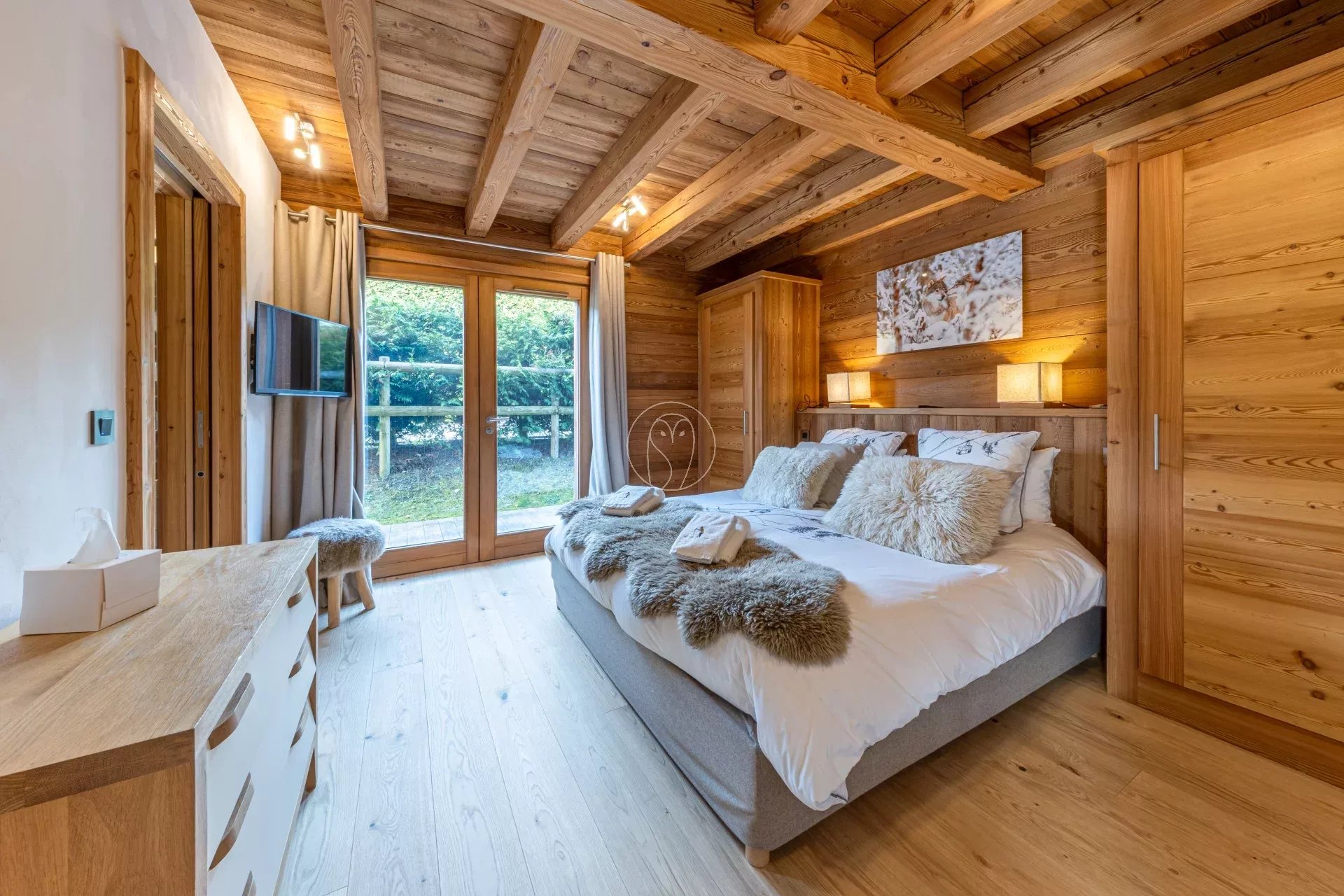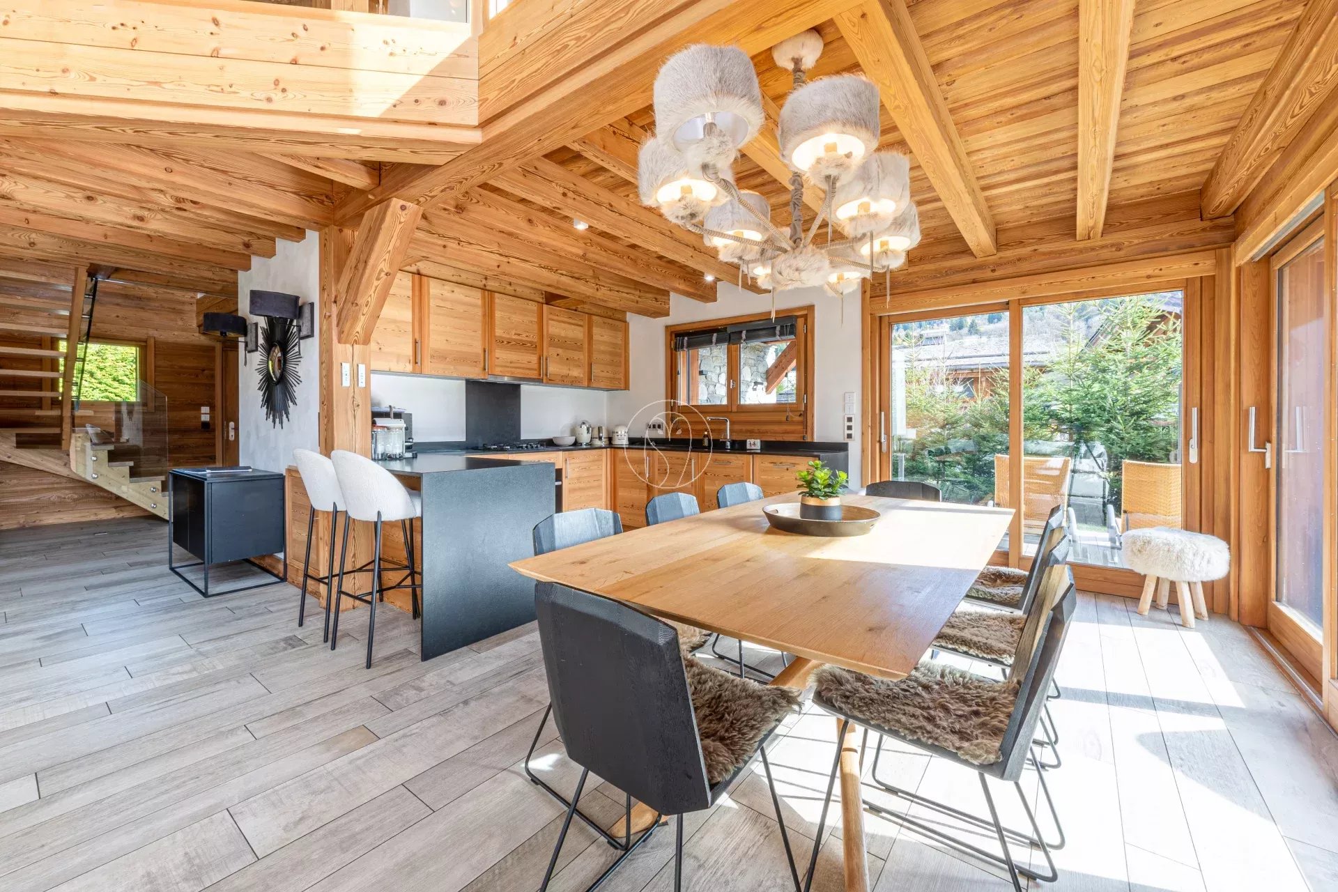 Les espaces extérieurs comprennent un jardin, une terrasse exposée sud-ouest et un bain nordique. Le chalet dispose également d’équipements dédiés au bien-être, avec un hammam privatif, ainsi qu’un ski room fonctionnel.