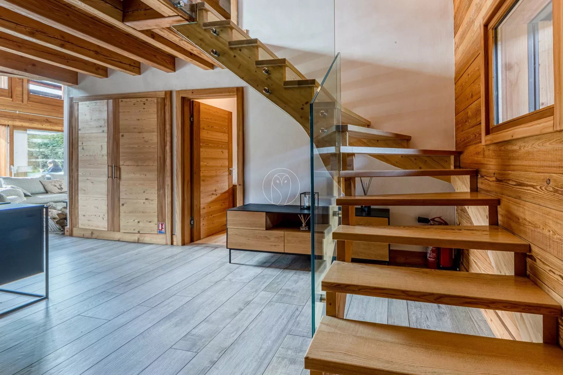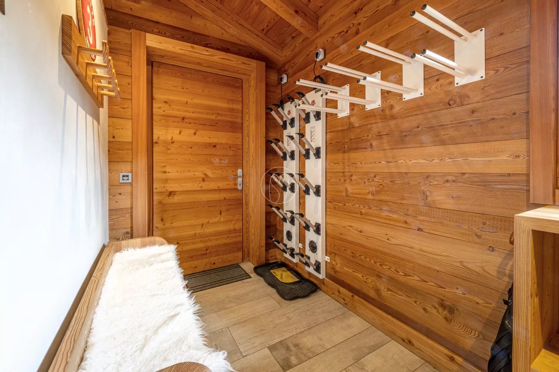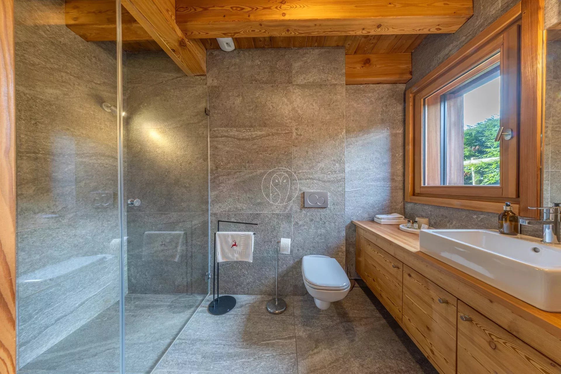 Les espaces extérieurs comprennent un jardin, une terrasse exposée sud-ouest et un bain nordique. Le chalet dispose également d’équipements dédiés au bien-être, avec un hammam privatif, ainsi qu’un ski room fonctionnel.