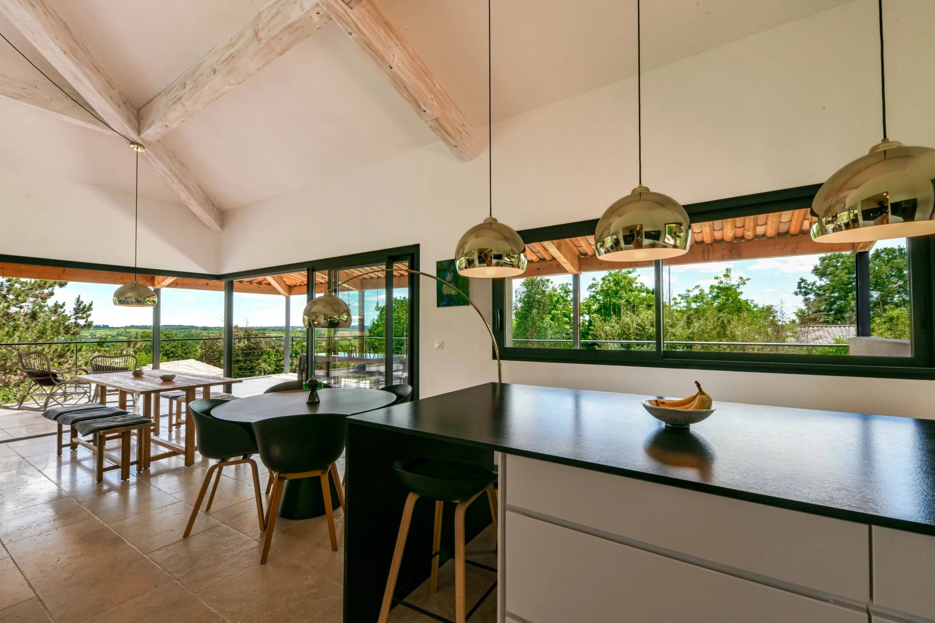 Superbe ensemble de réception ouvert sur une terrasse avec vue panoramique.