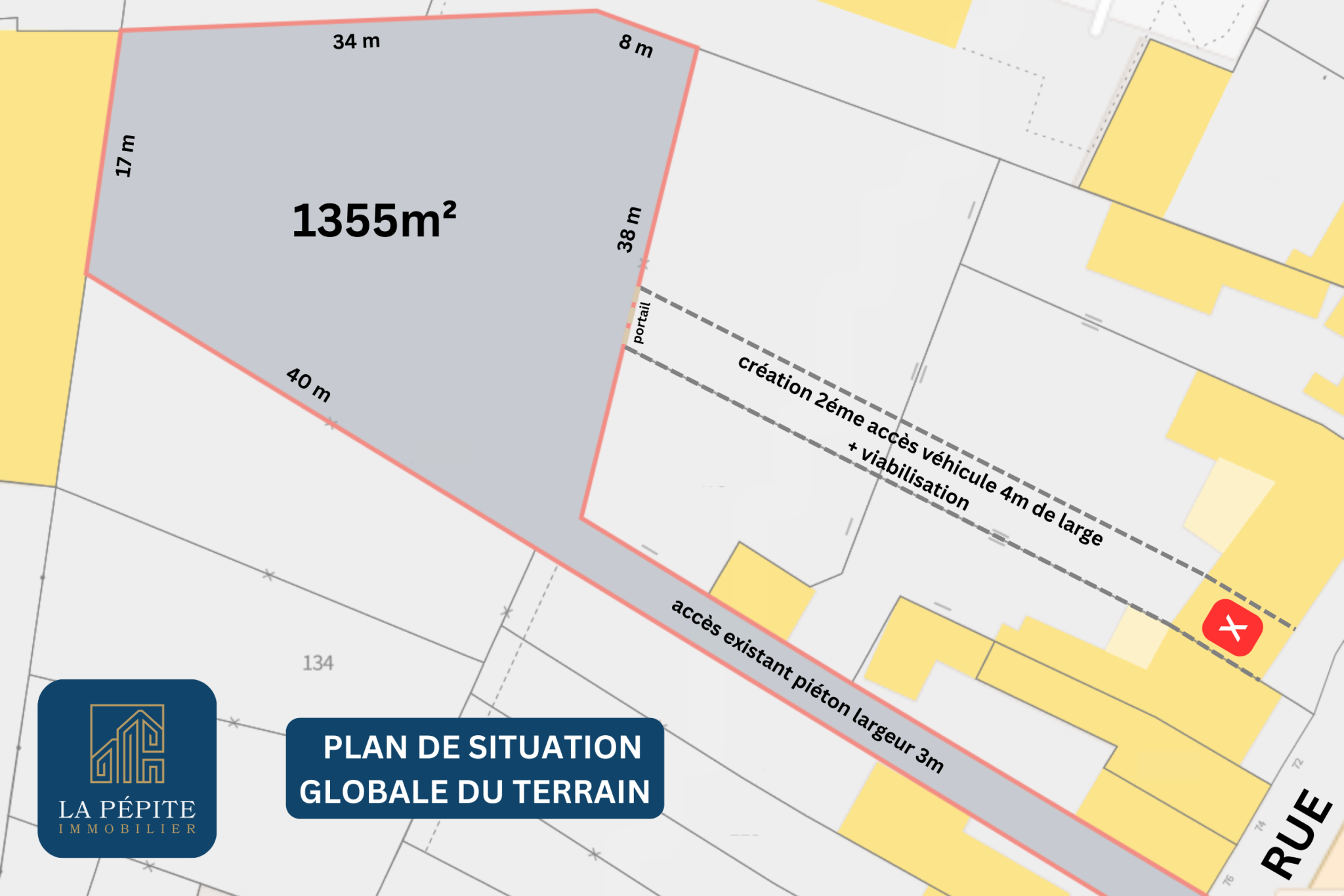 Situation : il y a deux terrains à bâtir en retrait de rue avec un accès unique qui sera créé. Largeur 4m.