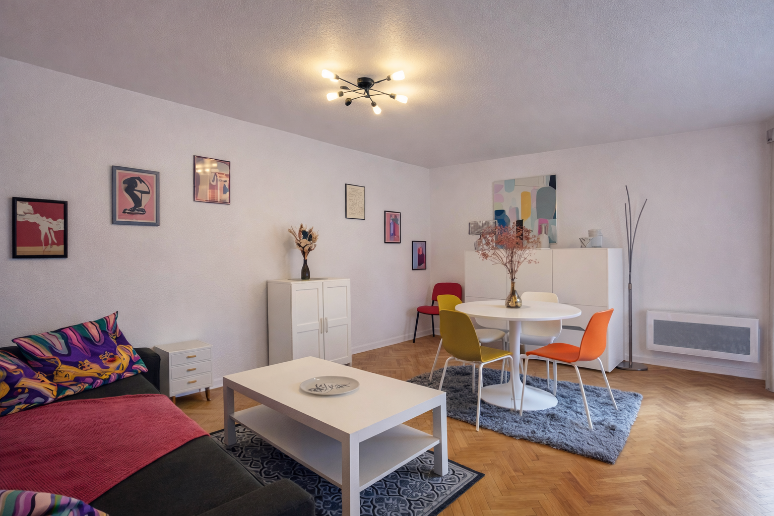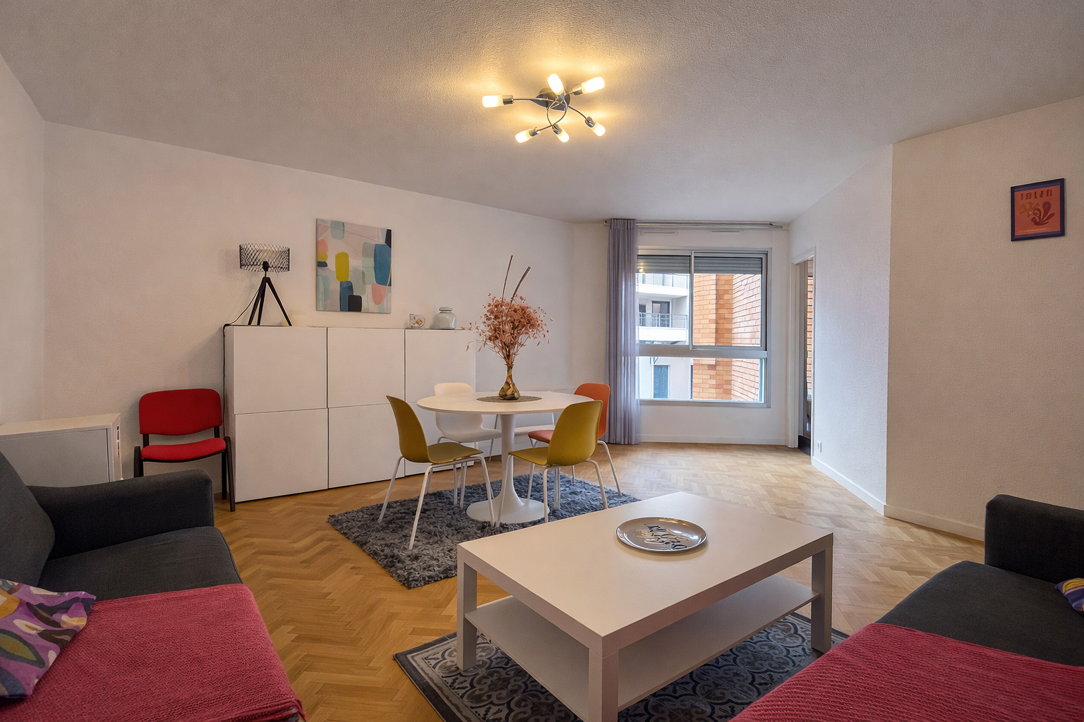 un séjour / salle à manger lumineux, ouvert sur la cuisine,