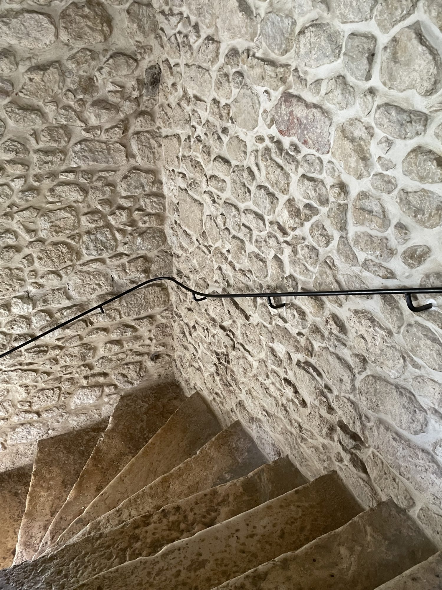Escalier monumental en pierre du XVe siècle, éclairé par une fenêtre donnant sur la cour intérieure