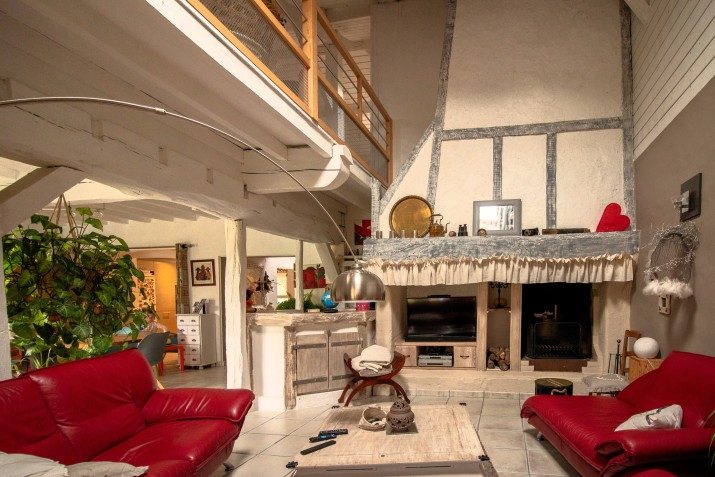 Le coin salon profite d'une cheminée, d'une belle charpente traditionnelle avec une grande hauteur sous plafond.